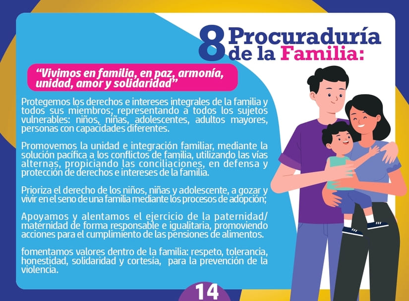 8. Procuraduría de la Familia: Protege los derechos e intereses de la familia, representando a todos los sujetos vulnerables: niños, niñas, adolescentes, adultos mayores, personas con capacidades diferentes, etc.