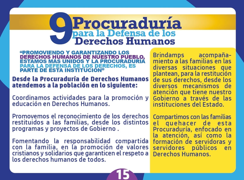 9. Procuraduría para la Defensa de los Derechos Humanos: Promueve el reconocimiento de los derechos restituidos a las familias, desde los distintos programas y Proyectos del GRUN.