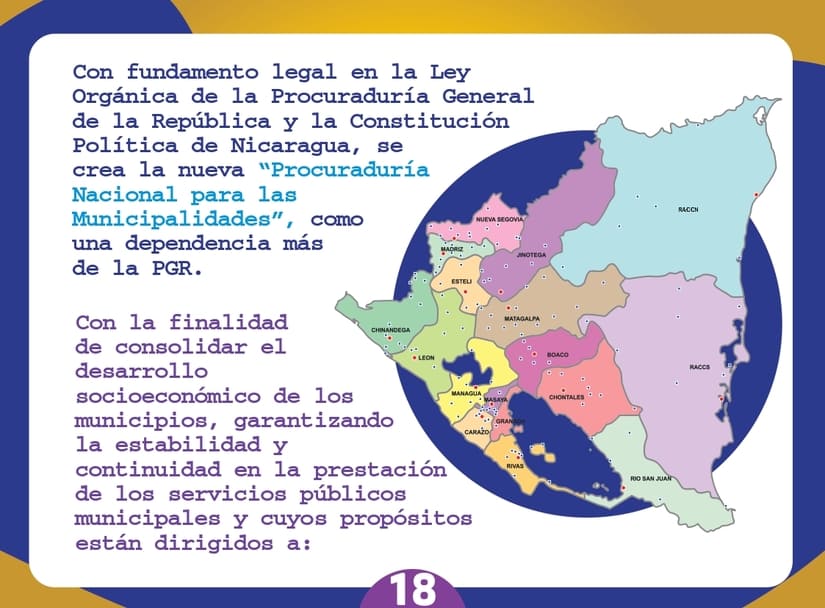 IV- Para fortalecer todos estos esfuerzos y con fundamento en la Ley Orgánica de la PGR y la Constitución Política de Nicaragua, se creará la nueva "Procuraduría para las Municipalidades", cuya finalidad es consolidar el desarrollo económico de los municipios, garantizando la estabilidad y continuidad en la prestación de los servicios públicos municipales.