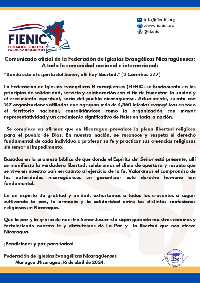 Basados en la promesa bíblica de que donde el Espíritu del Señor está presente, allí se manifiesta la verdadera libertad, celebramos el clima de apertura y respeto que se vive en nuestro país en cuanto al ejercicio de la fe. Valoramos el compromiso de las autoridades nicaragüenses en garantizar este derecho humano tan fundamental.