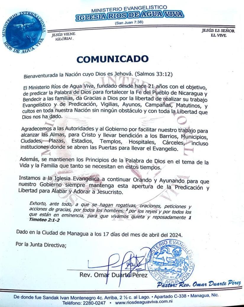 Comunicado de la Junta Directiva del Ministerio Ríos de Agua Viva, relativo a la Libertad de Culto en nuestro País.