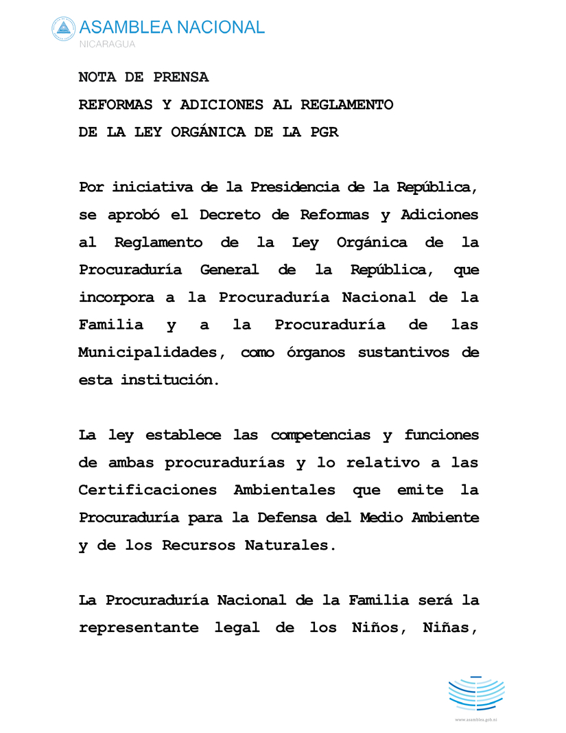 Por iniciativa de la Presidencia de la República, se aprobó el Decreto de Reformas y Adiciones al Reglamento de la Ley Orgánica de la Procuraduría General de la República, que incorpora a la Procuraduría Nacional de la Familia y a la Procuraduría de las Municipalidades, como órganos sustantivos de esta institución.