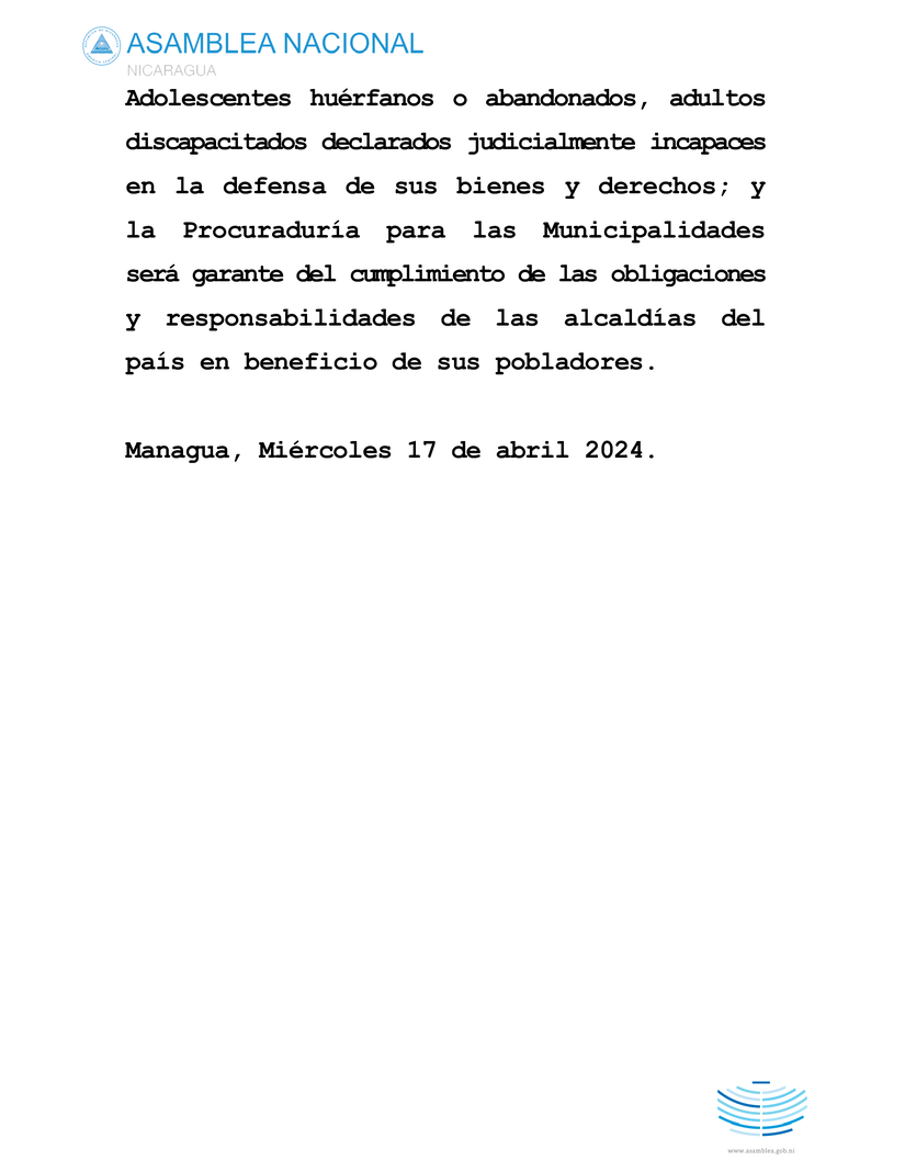 La Procuraduría Nacional de la Familia será la representante legal de los Niños, Niñas, Adolescentes huérfanos o abandonados, adultos discapacitados declarados judicialmente incapaces en la defensa de sus bienes y derechos; y la Procuraduría para las Municipalidades será garante del cumplimiento de las obligaciones y responsabilidades de las alcaldías del país en beneficio de sus pobladores.