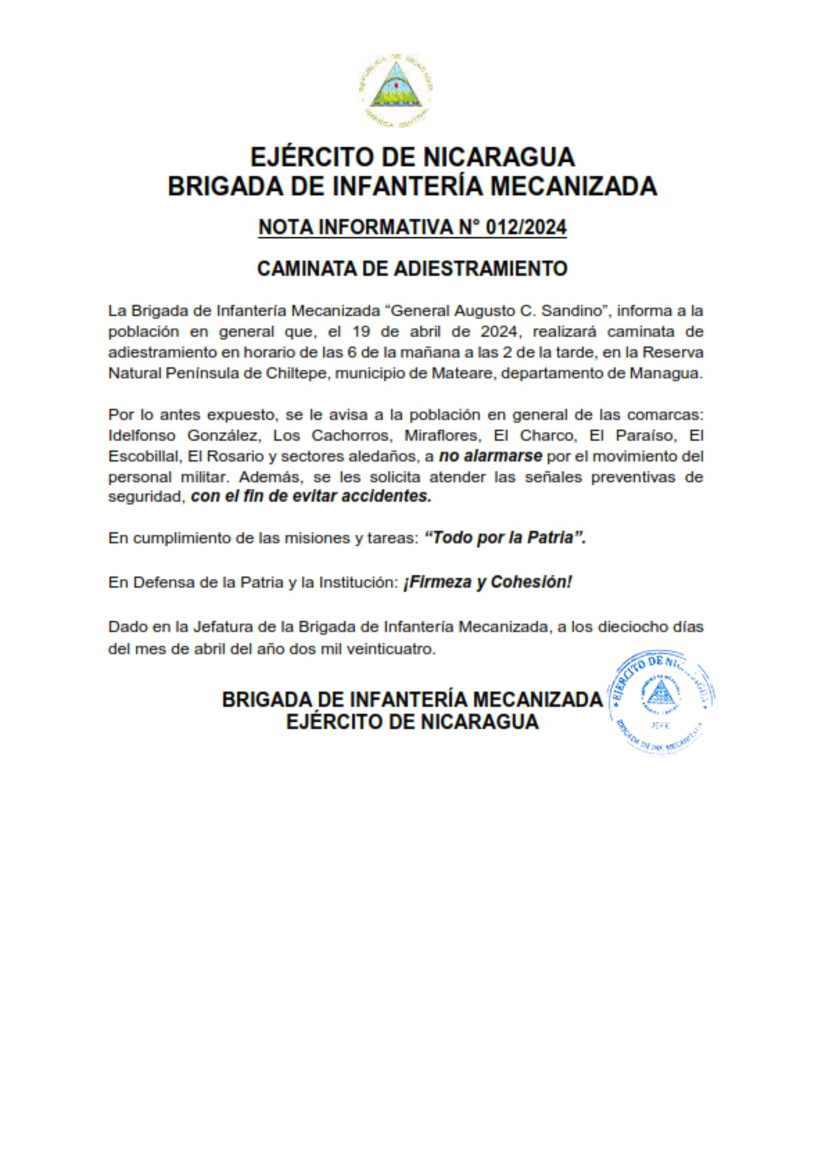 La Brigada de Infantería Mecanizada “General Augusto C. Sandino”, informa a la población en general que, el 19 de abril de 2024, realizará caminata de adiestramiento en horario de las 6 de la mañana a las 2 de la tarde, en la Reserva Natural Península de Chiltepe, municipio de Mateare, departamento de Managua.