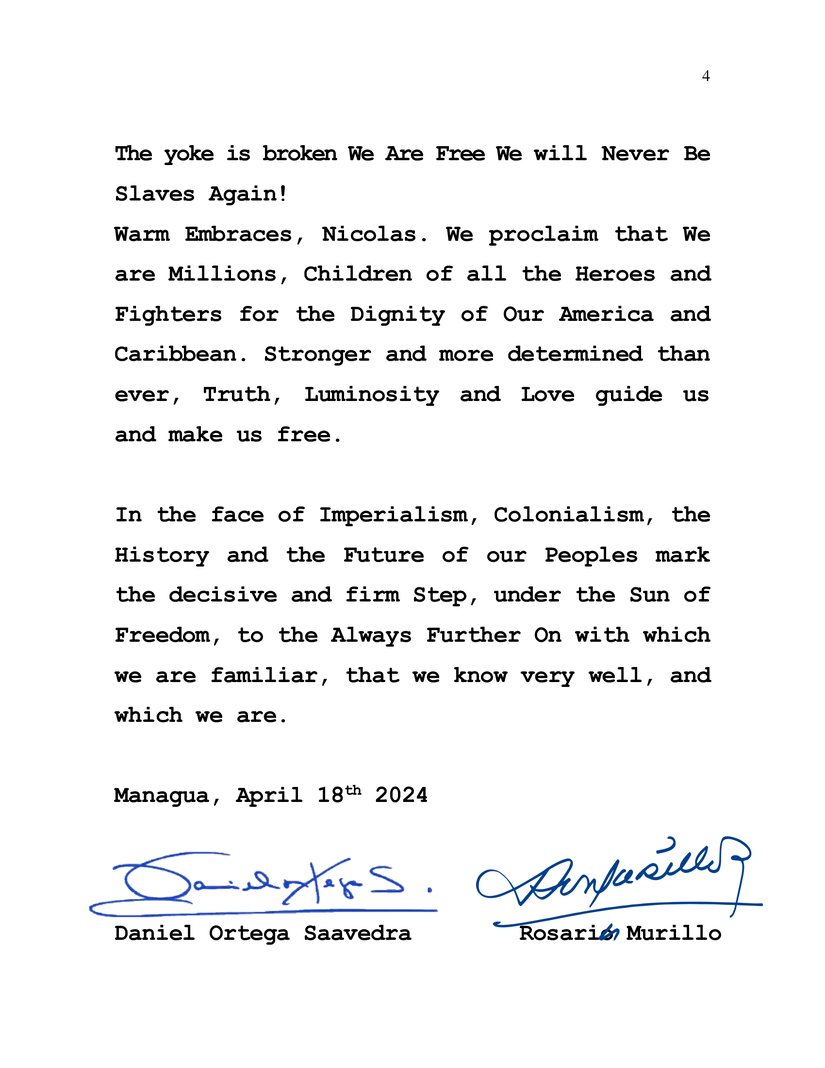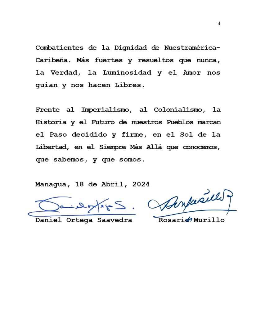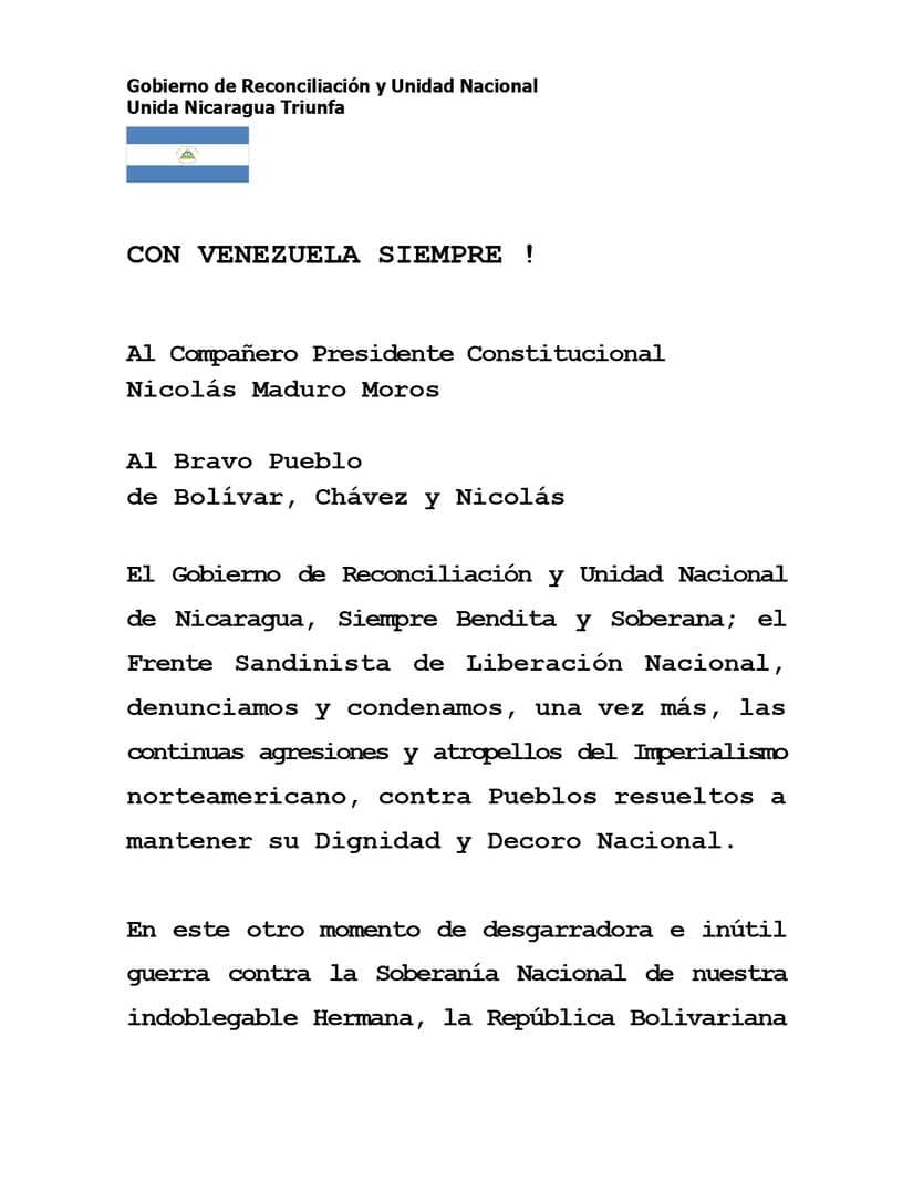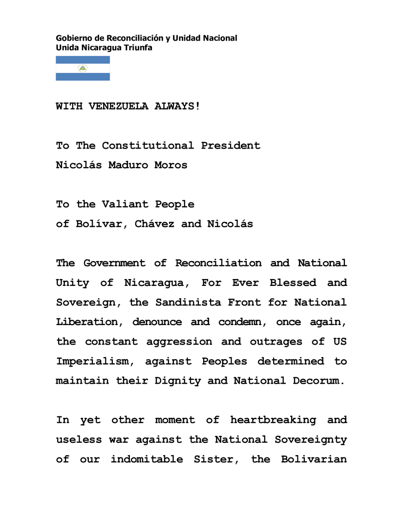 El Gobierno de Reconciliación y Unidad Nacional de Nicaragua, Siempre Bendita y Soberana; el Frente Sandinista de Liberación Nacional, denunciamos y condenamos, una vez más, las continuas agresiones y atropellos del Imperialismo norteamericano, contra Pueblos resueltos a mantener su Dignidad y Decoro Nacional.