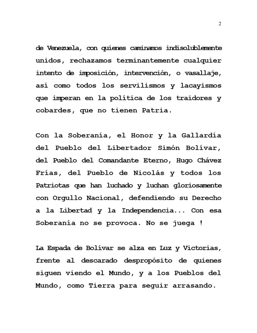 Con la Soberanía, el Honor y la Gallardía del Pueblo del Libertador Simón Bolívar, del Pueblo del Comandante Eterno, Hugo Chávez Frías, del Pueblo de Nicolás y todos los Patriotas que han luchado y luchan gloriosamente con Orgullo Nacional, defendiendo su Derecho a la Libertad y la Independencia... Con esa Soberanía no se provoca. No se juega !