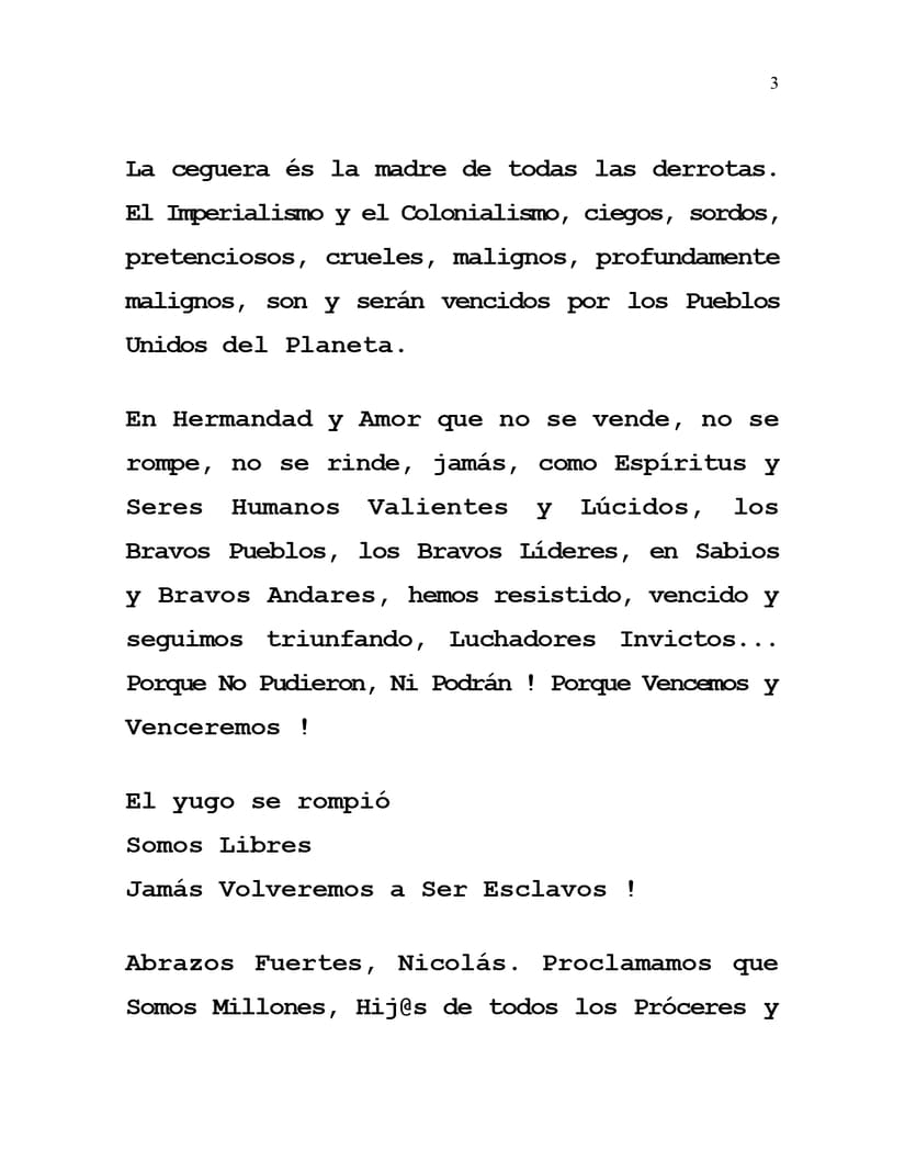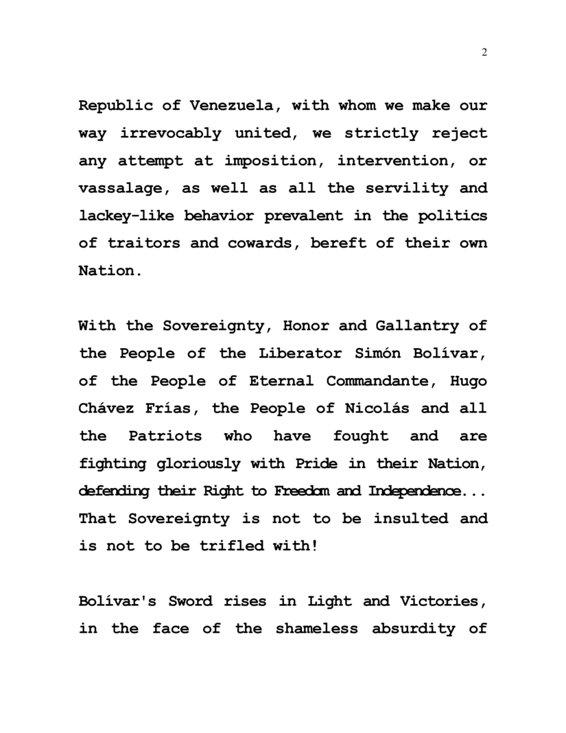 En este otro momento de desgarradora e inútil guerra contra la Soberanía Nacional de nuestra indoblegable Hermana, la República Bolivariana de Venezuela, con quienes caminamos indisolublemente unidos, rechazamos terminantemente cualquier intento de imposición, intervención, o vasallaje, así como todos los servilismos y lacayismos que imperan en la política de los traidores y cobardes, que no tienen Patria.