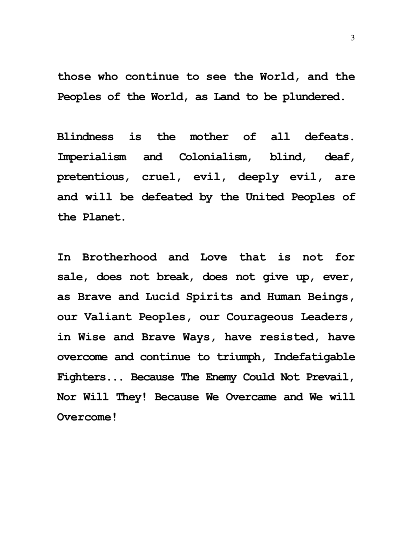 La ceguera és la madre de todas las derrotas. El Imperialismo y el Colonialismo, ciegos, sordos, pretenciosos, crueles, malignos, profundamente malignos, son y serán vencidos por los Pueblos Unidos del Planeta.