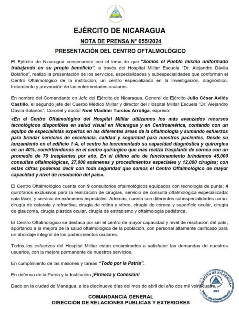 El Ejército de Nicaragua consecuente con el lema de que "Somos el Pueblo mismo uniformado trabajando en su propio beneficio", a través del Hospital Militar Escuela "Dr. Alejandro Dávila Bolaños", realizó la presentación de los servicios, especialidades y subespecialidades que conforman el Centro Oftalmológico de la institución, un centro especializado en la investigación, diagnóstico, tratamiento y prevención de las enfermedades oculares.