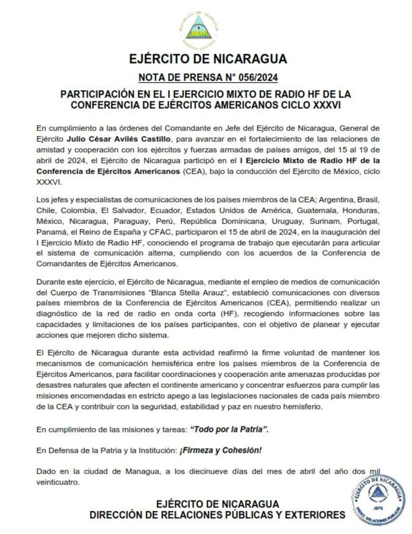 En cumplimiento a las órdenes del Comandante en Jefe del Ejército de Nicaragua, General de Ejército Julio César Avilés Castillo, para avanzar en el fortalecimiento de las relaciones de amistad y cooperación con los ejércitos y fuerzas armadas de países amigos, del 15 al 19 de abril de 2024, el Ejército de Nicaragua participó en el I Ejercicio Mixto de Radio HF de la Conferencia de Ejércitos Americanos (CEA), bajo la conducción del Ejército de México, cicio XXXVI.