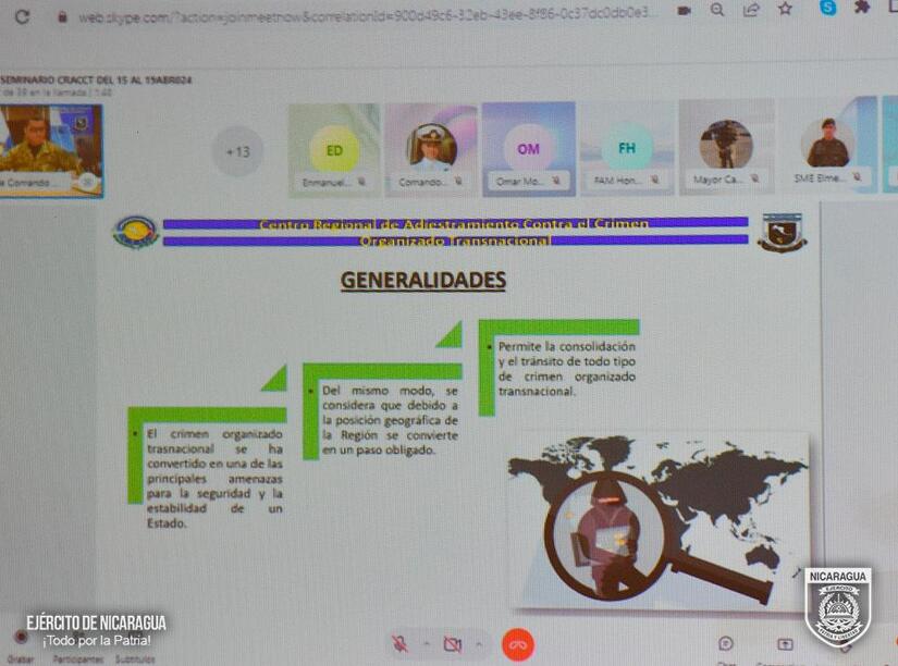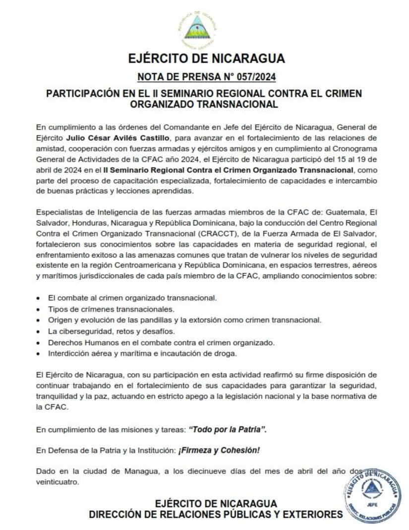 En cumplimiento a las órdenes del Comandante en Jefe del Ejército de Nicaragua, General de Ejército Julio César Avilés Castillo, para avanzar en el fortalecimiento de las relaciones de amistad, cooperación con fuerzas armadas y ejércitos amigos y en cumplimiento al Cronograma General de Actividades de la CFAC año 2024, el Ejército de Nicaragua participó del 15 al 19 de abril de 2024 en el II Seminario Regional Contra el Crimen Organizado Transnacional, como parte del proceso de capacitación especializada, fortalecimiento de capacidades e intercambio de buenas prácticas y lecciones aprendidas.