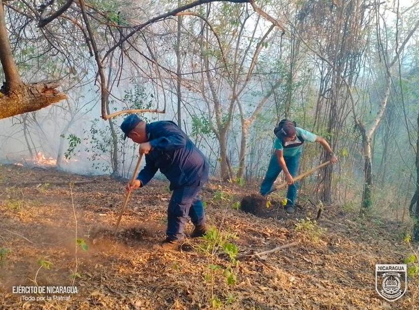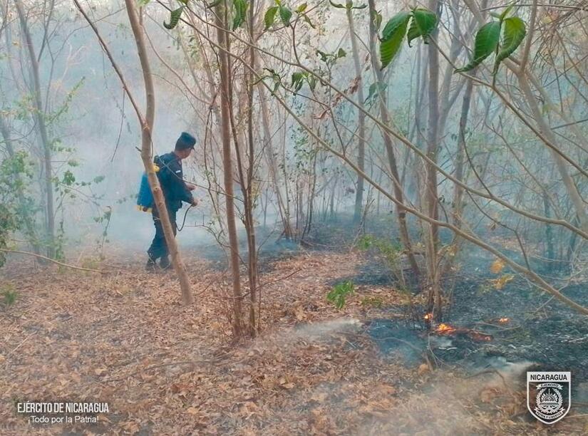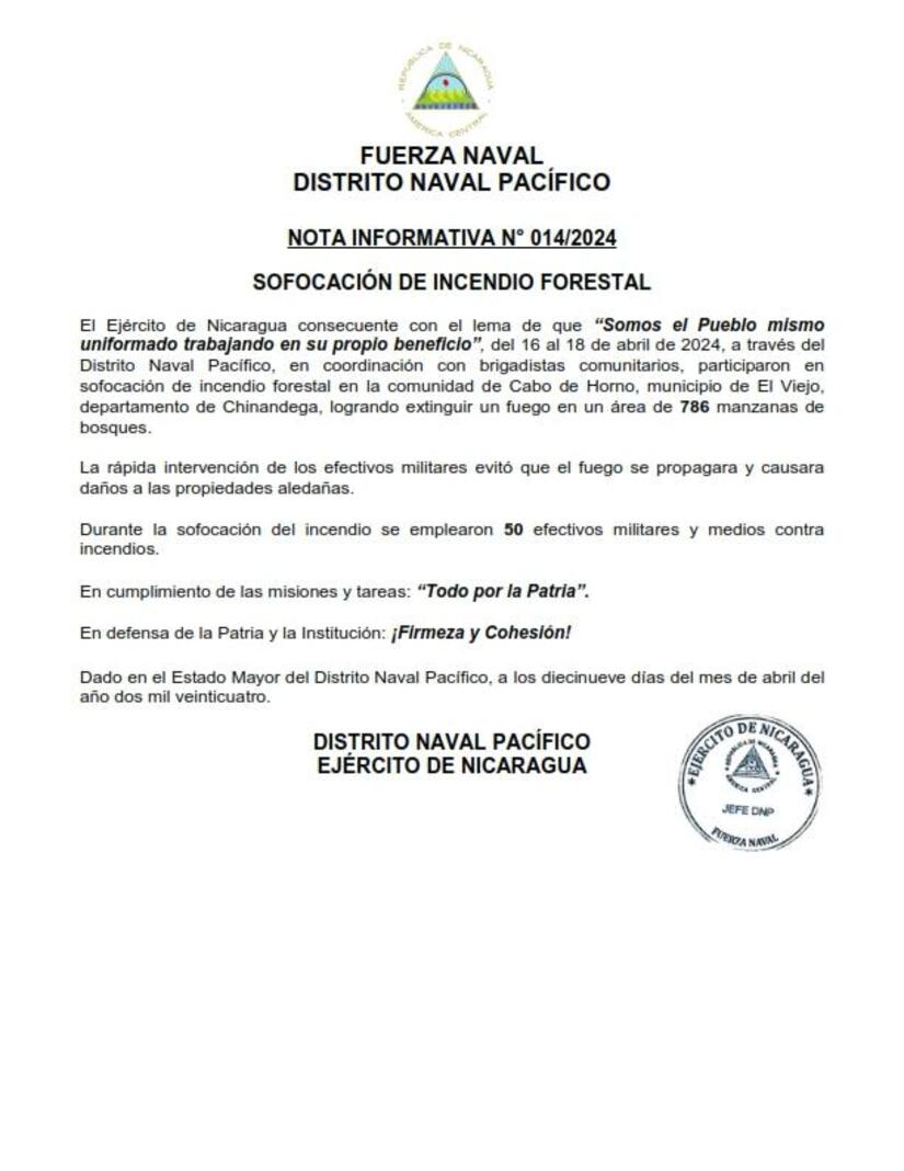 El Ejército de Nicaragua consecuente con el lema de que "Somos el Pueblo mismo uniformado trabajando en su propio beneficio", del 16 al 18 de abril de 2024, a través del Distrito Naval Pacifico, en coordinación con brigadistas comunitarios, participaron en sofocación de incendio forestal en la comunidad de Cabo de Horno, municipio de El Viejo, departamento de Chinandega, logrando extinguir un fuego en un área de 786 manzanas de bosques.