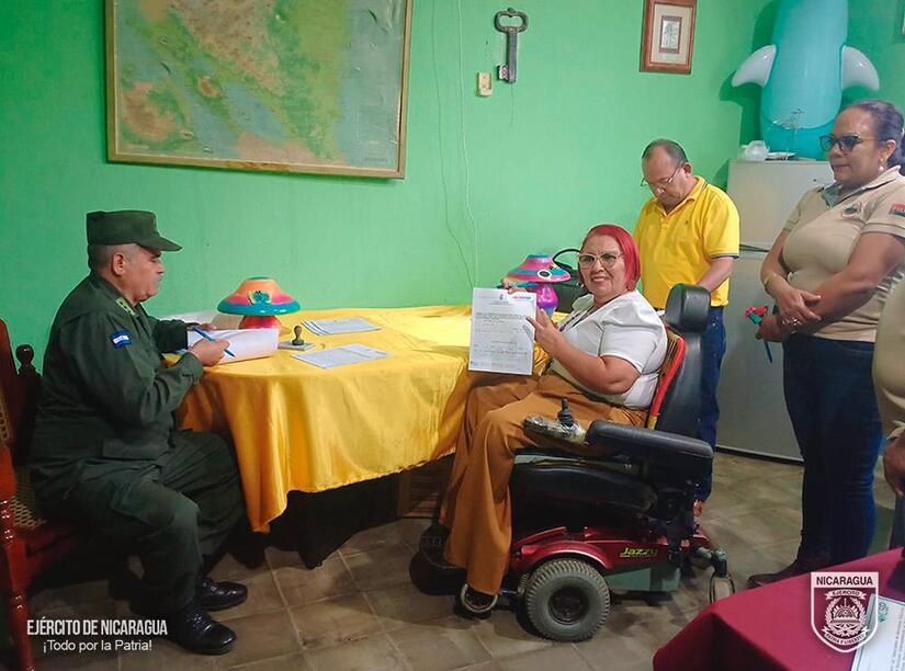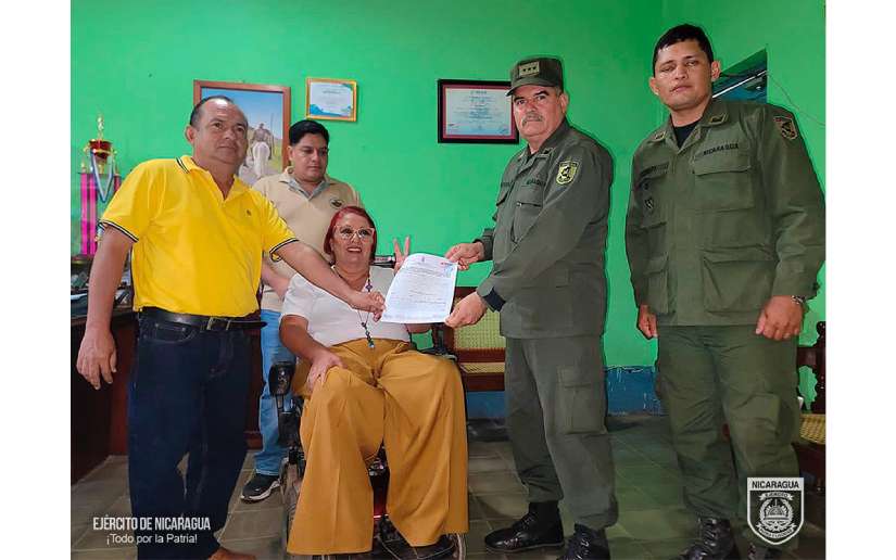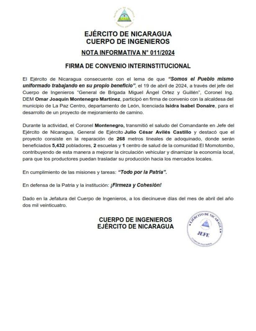 El Ejército de Nicaragua consecuente con el lema de que "Somos el Pueblo mismo uniformado trabajando en su propio beneficio", el 19 de abril de 2024, a través del jefe del Cuerpo de Ingenieros "General de Brigada Miguel Ángel Ortez y Guillén, Coronel Ing. DEM Omar Joaquin Montenegro Martínez, participó en firma de convenio con la alcaldesa del municipio de La Paz Centro, departamento de León, licenciada Isidra Isabel Donaire, para el desarrollo de un proyecto de mejoramiento de camino.