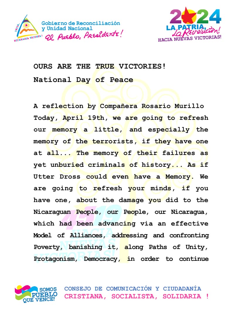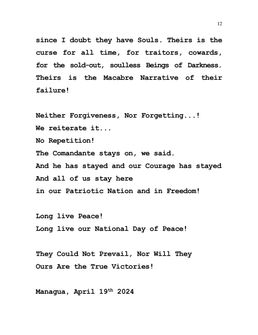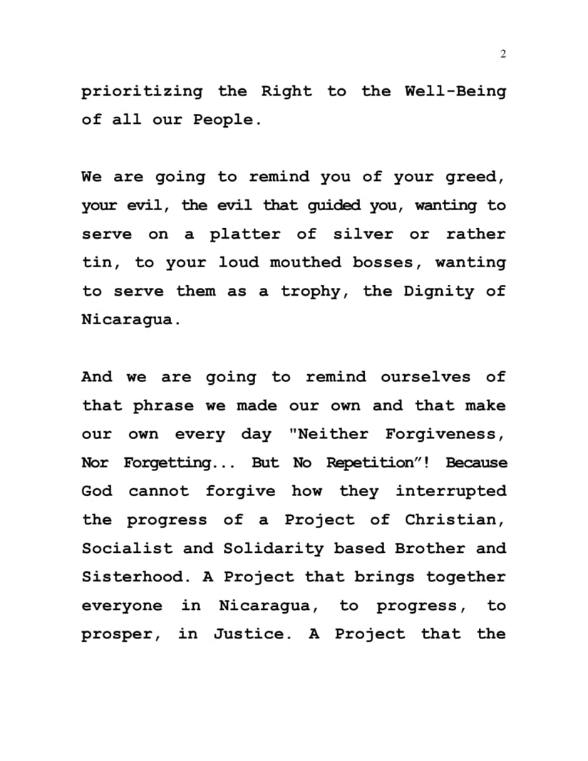 Y vamos a refrescarnos nosotros en esa frase que hicimos y hacemos nuestra todos los días : “Ni Perdón, Ni Olvido... Y No Repetición” ! Porque no tienen Perdón de Dios quienes interrumpieron el avance de un Proyecto de Hermandad Cristiana, Socialista y Solidaria. Un Proyecto que nos reúne a tod@s en Nicaragua, para progresar, para prosperar, para la Justicia. Y un Proyecto que ya la Fuerza Espiritual de nuestro Pueblo ha retomado.