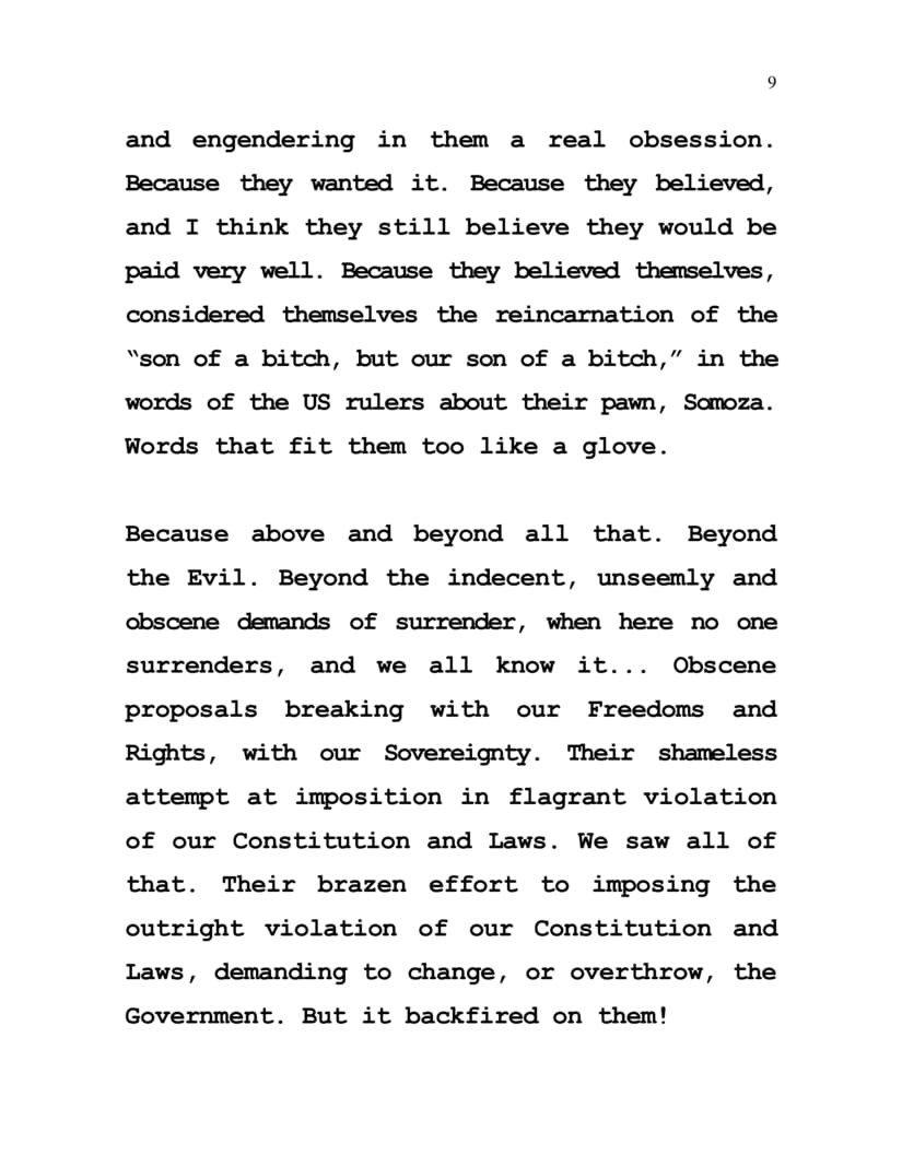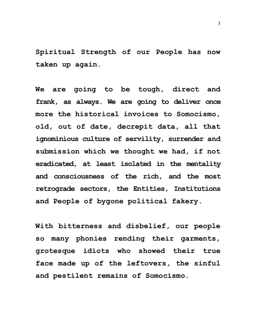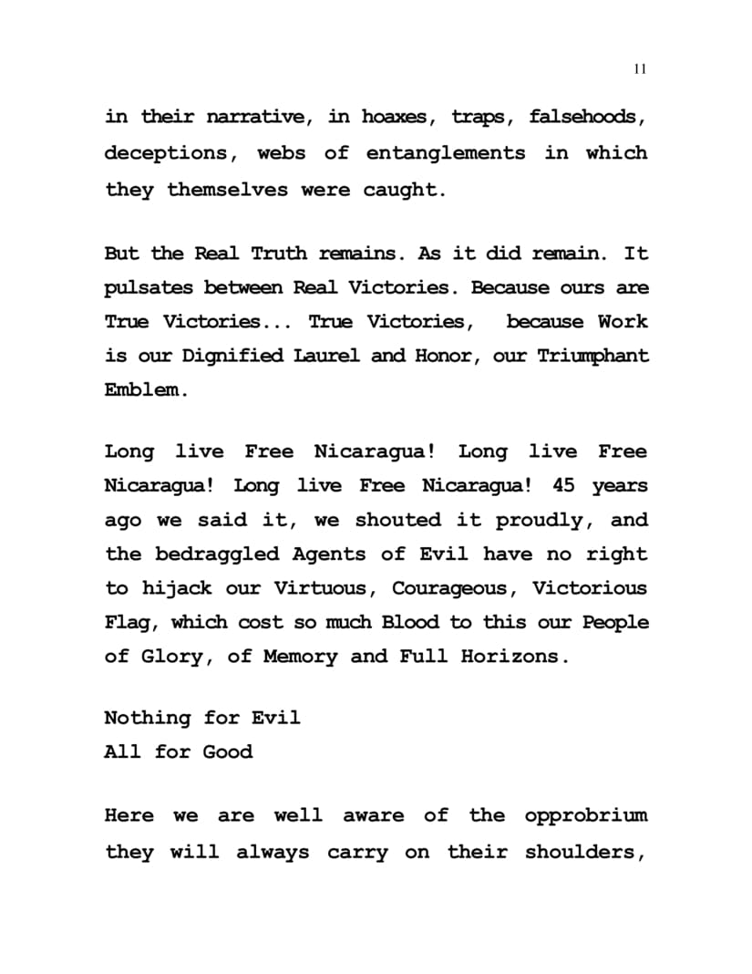 Vamos a refrescarles su codicia, su maldad, esa maldad que les guió, queriendo servir en bandeja de plata, o de lata, a sus vociferantes patrones, queriendo servirles como trofeo, la Dignidad de Nicaragua.