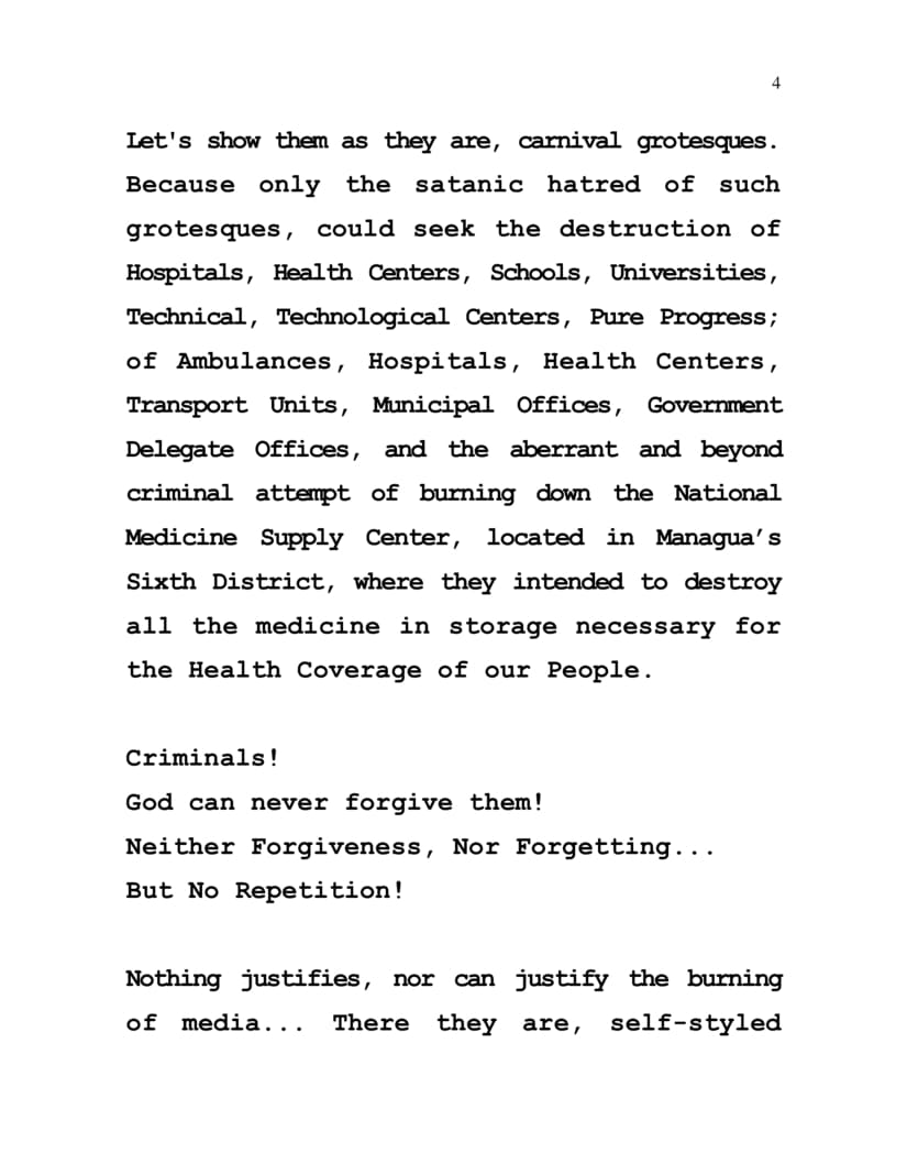 Vamos a exhibirlos como son. Adefesios de Carnaval. Porque sólo el odio satánico, de adefesios, puede buscar la destrucción de Hospitales, Centros de Salud, Escuelas, Universidades, Centros Técnicos, Tecnológicos, Progreso Puro; de Ambulancias, de Hospitales, Centros de Salud, Unidades de Transporte, de Alcaldías, de Delegaciones de Gobierno, y la intención aberrada y más que criminal de incendiar el Centro Nacional de Abastos de Medicamentos, ubicado en el Distrito VI de Managua, donde pretendían acabar con toda la medicina almacenada, necesaria para la cobertura de Salud a nuestro Pueblo.