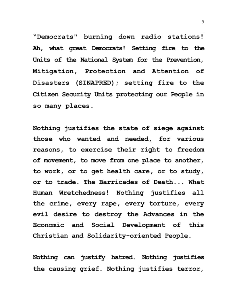 Nada justifica, ni puede justificar las quemas de Medios de Comunicación... Ah, “los demócratas” quemando las Radios ! Ah, qué clase de demócratas ! La quema de Unidades del Sistema Nacional para la Prevención, Mitigación, Protección y Atención de Desastres (SINAPRED); las quemas de las Unidades de Seguridad Ciudadana que protegen a nuestro Pueblo en tantos lugares.