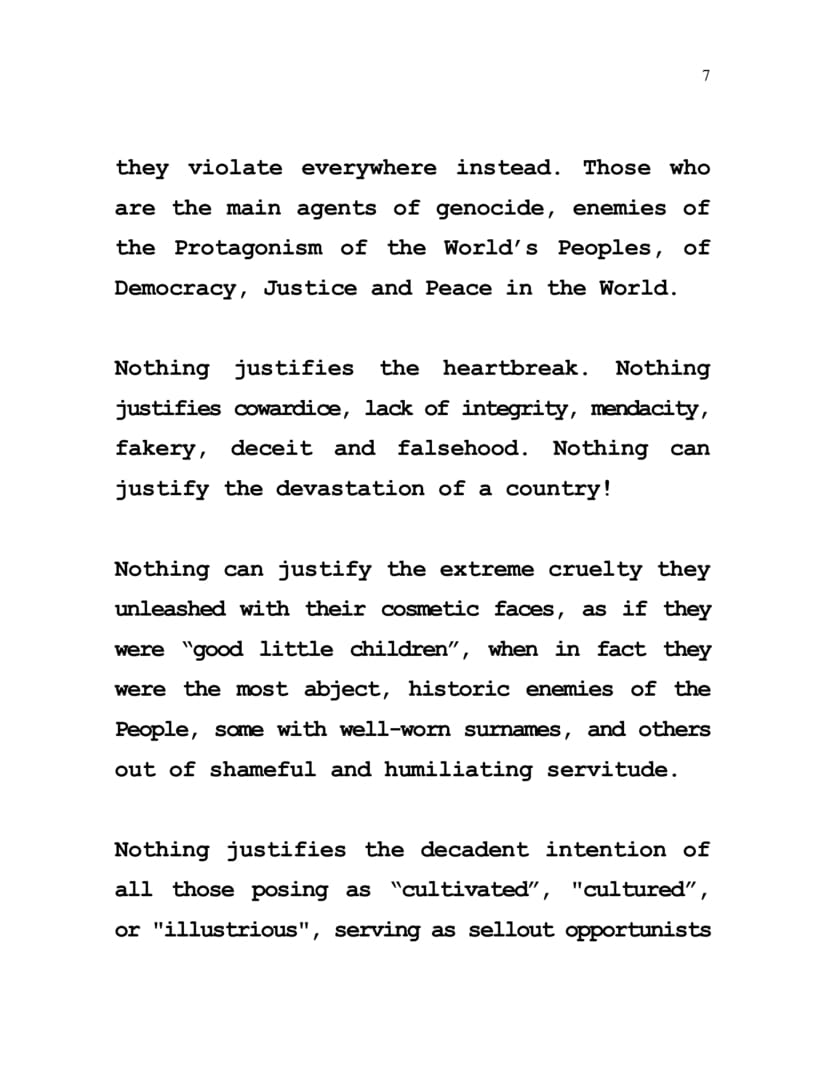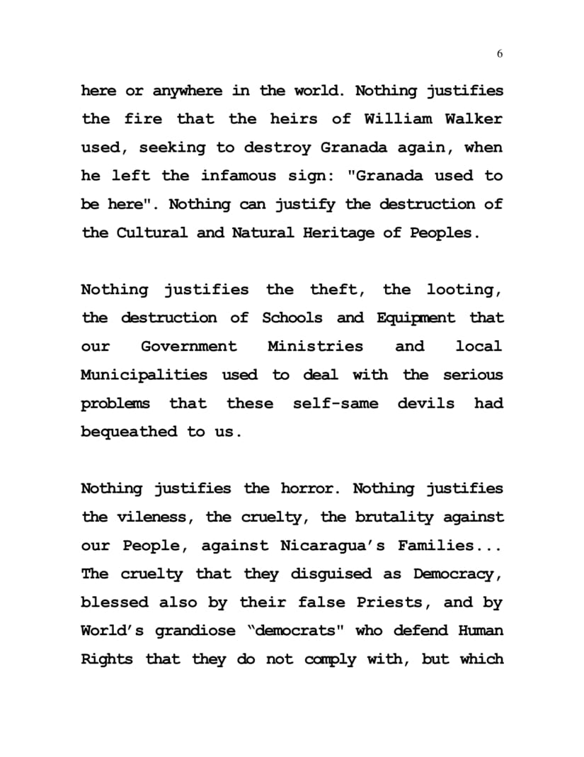 Nada justifica el horror. Nada justifica la vileza, la crueldad, el ensañamiento contra el Pueblo, contra las Familias nicaragüenses... El ensañamiento que disfrazaban de Democracia, bendecido además por falsos Sacerdotes, y por los “grandes demócratas” del Mundo, esos que defienden Derechos Humanos que no cumplen, que violan más bien en todas partes. Esos que son los principales genocidas y enemigos del Protagonismo de los Pueblos, de la Democracia, la Justicia y la Paz en el Mundo.