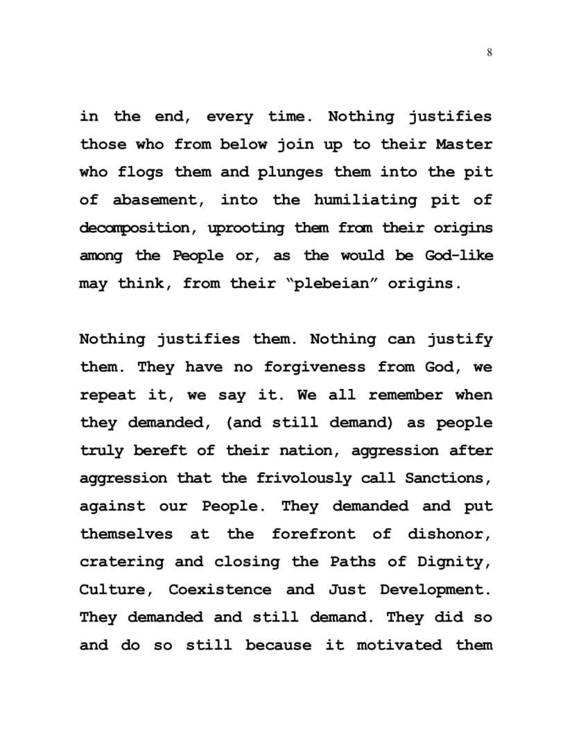 Nada los justifica. Nada los puede justificar. No tienen Perdón de Dios, lo repetimos, lo decimos. Nos acordamos tod@s cuando exigieron, (y exigen aún) como verdaderos apátridas, agresiones y agresiones que festivamente han llamado Sanciones, contra nuestro Pueblo. Exigieron y se pusieron al frente de la deshonra, horadando y cerrando Caminos de Dignidad, Cultura, Convivencia y Desarrollo Justo. Exigieron y Exigen. Y lo hacían y lo hacen porque les daba y les da la real gana. Porque se les antojaba. Porque creían, creo que todavía creen que les pagarían bien. Porque se creían, se consideraban la reencarnación del “hijo de puta, que és nuestro hijo de puta”, en palabras textuales de los Gobernantes norteamericanos sobre su peón, Somoza. Palabras que les calzan como guante.