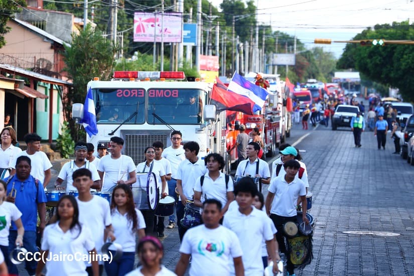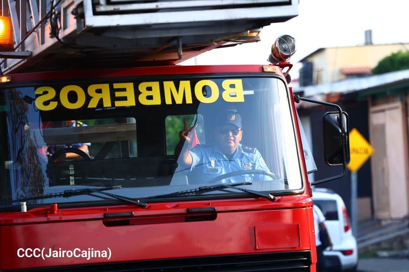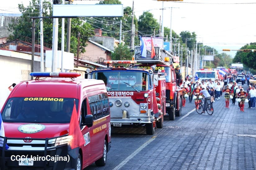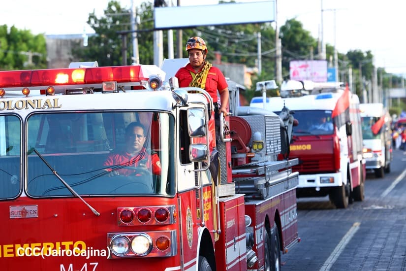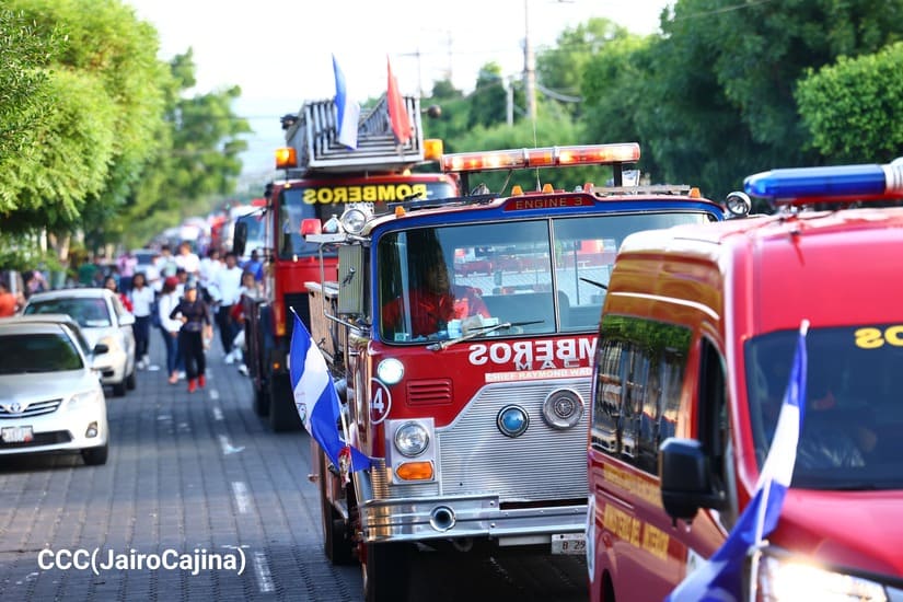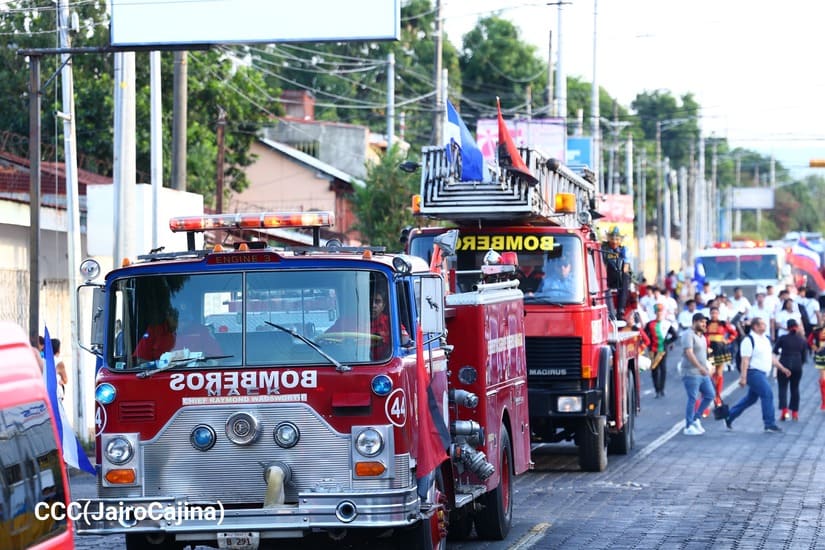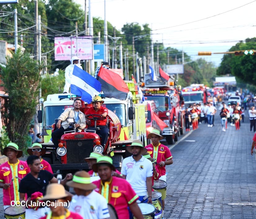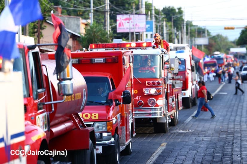 Los Bomberos Unidos del Ministerio del Interior (Mint) con la colaboración de la Juventud Sandinista realizaron desfile de comparsas y camiones de bomberos, por la Paz, por las distintas calles del Distrito Dos de Managua.