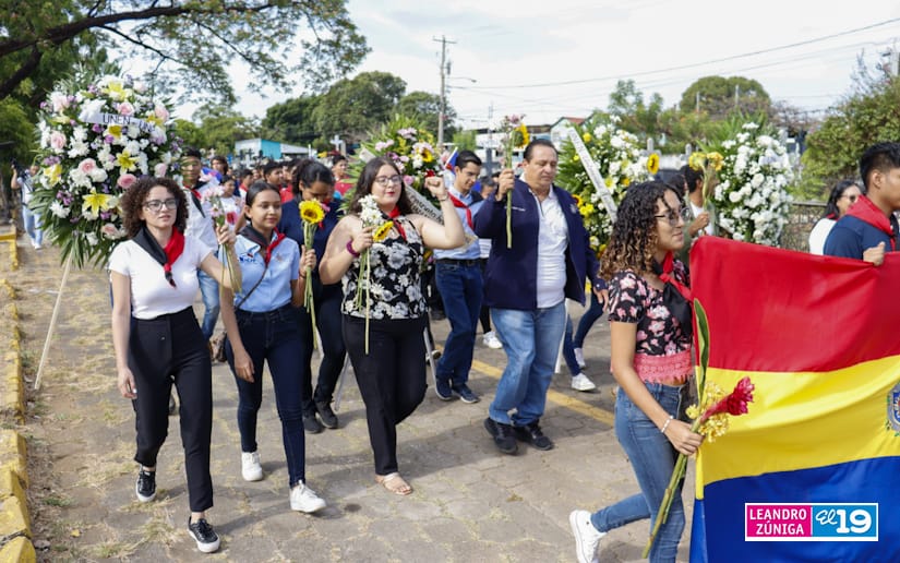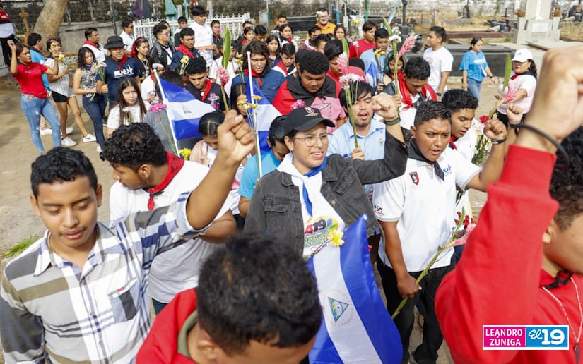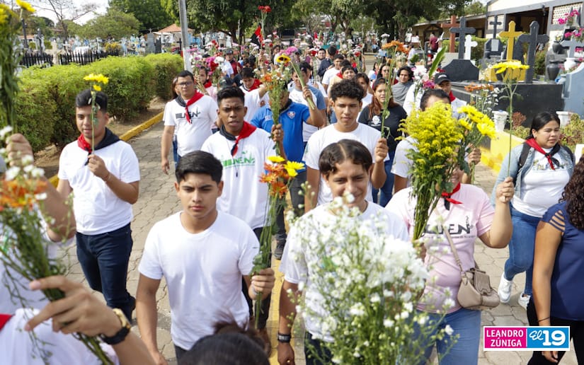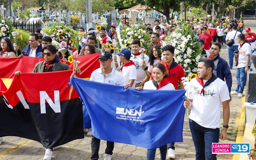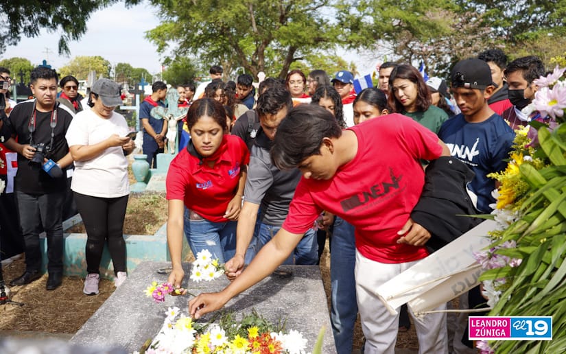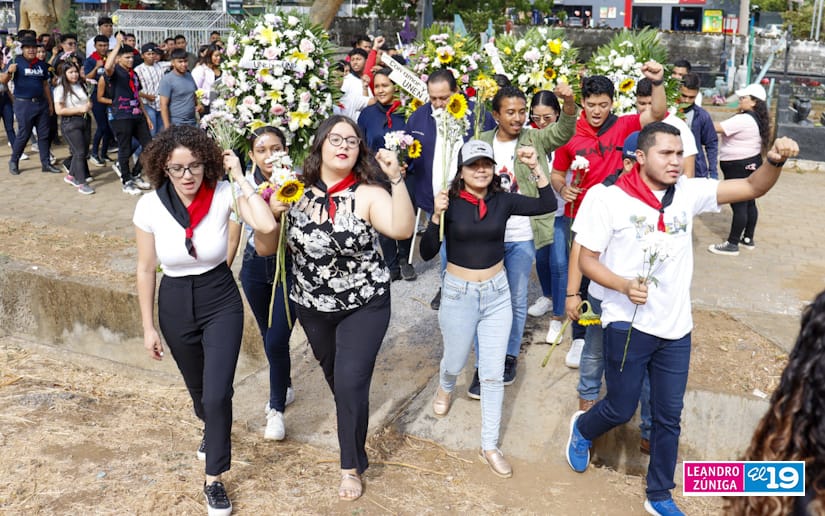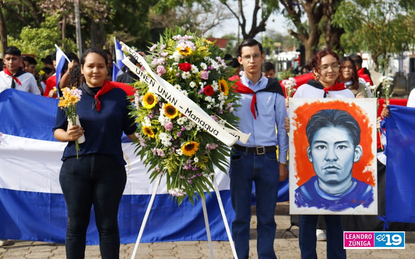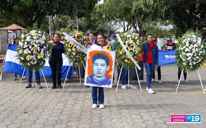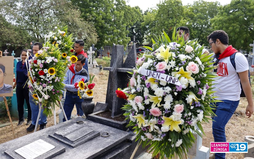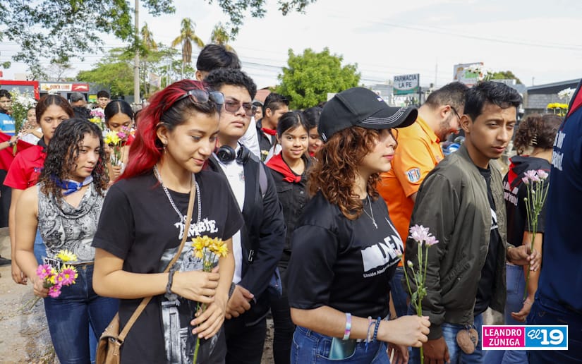 Con ofrendas florales, música y consignas revolucionarias universitarios de los recintos de la UNAN-Managua y otras universidades miembros del CNU, le rindieron homenaje y honraron su memoria.