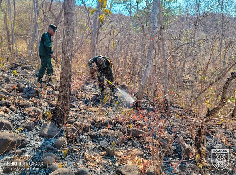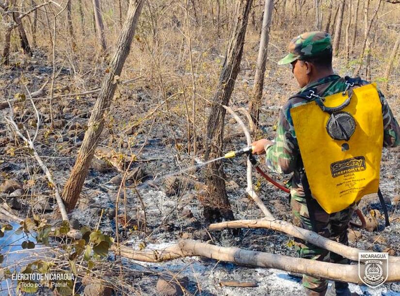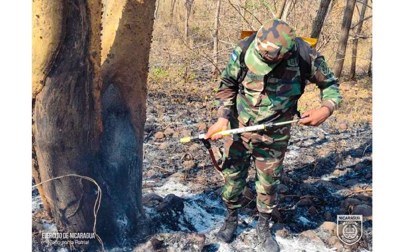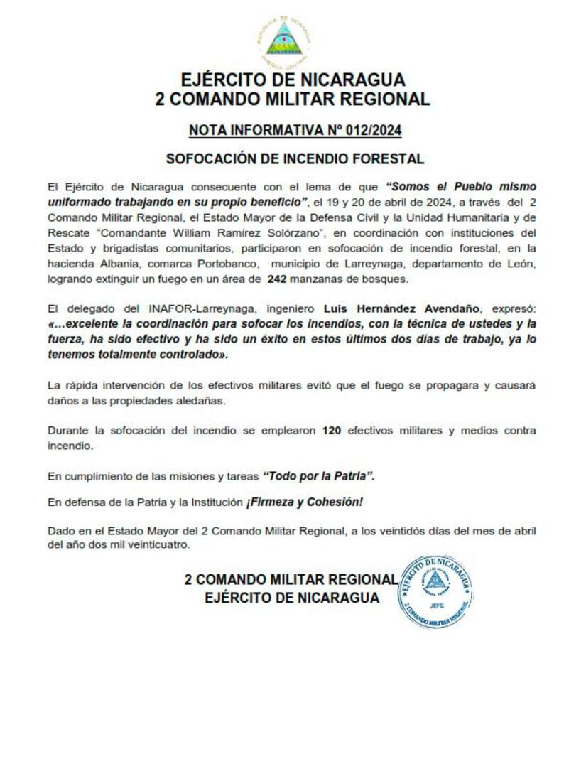 El Ejército de Nicaragua consecuente con el lema de que "Somos el Pueblo mismo uniformado trabajando en su propio beneficio", el 19 y 20 de abril de 2024, a través del 2 Comando Militar Regional, el Estado Mayor de la Defensa Civil y la Unidad Humanitaria y de Rescate "Comandante William Ramirez Solórzano", en coordinación con instituciones del Estado y brigadistas comunitarios, participaron en sofocación de incendio forestal, en la hacienda Albania, comarca Portobanco, municipio de Larreynaga, departamento de León, logrando extinguir un fuego en un área de 242 manzanas de bosques.