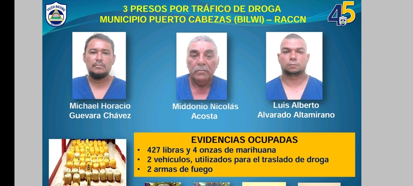 Informó también la captura de tres individuos por tráfico de droga, en Puerto Cabezas, Bilwi. Ellos son Luis Horacio Guevara Chávez, Victorio Nicolás Acosta y Luis Alberto Alvarado Altamirano.