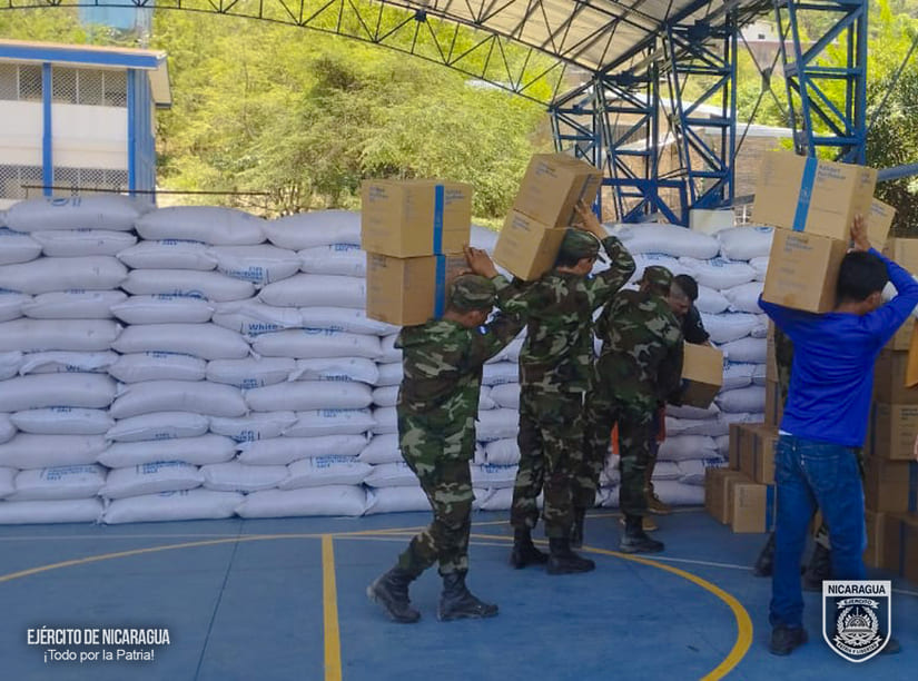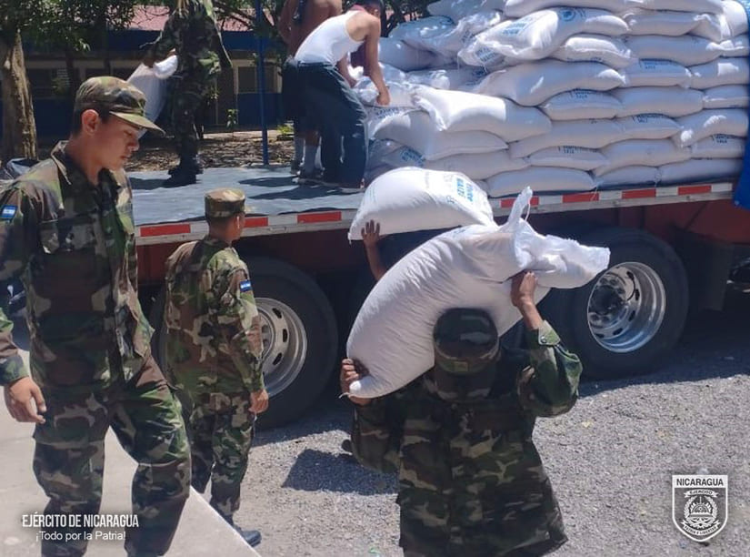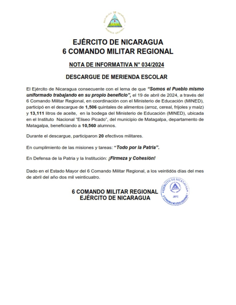 El Ejército de Nicaragua consecuente con el lema de que “Somos el Pueblo mismo uniformado trabajando en su propio beneficio”, el 19 de abril de 2024, a través del 6 Comando Militar Regional, en coordinación con el Ministerio de Educación (MINED), participó en el descargue de 1,506 quintales de alimentos (arroz, cereal, frijoles y maíz) y 13,111 litros de aceite, en la bodega del Ministerio de Educación (MINED), ubicada en el Instituto Nacional “Eliseo Picado”, del municipio de Matagalpa, departamento de Matagalpa, beneficiando a 10,560 alumnos.