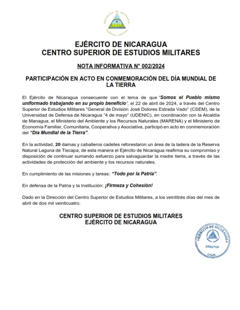 El Ejército de Nicaragua consecuente con el lema de que “Somos el Pueblo mismo uniformado trabajando en su propio beneficio”, el 22 de abril de 2024, a través del Centro Superior de Estudios Militares “General de División José Dolores Estrada Vado” (CSEM), de la Universidad de Defensa de Nicaragua “4 de mayo” (UDENIC), en coordinación con la Alcaldía de Managua, el Ministerio del Ambiente y los Recursos Naturales (MARENA) y el Ministerio de Economía Familiar, Comunitaria, Cooperativa y Asociativa, participó en acto en conmemoración del “Día Mundial de la Tierra”.