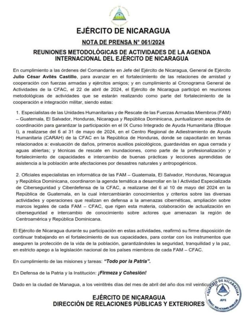 En cumplimiento a las órdenes del Comandante en Jefe del Ejército de Nicaragua, General de Ejército Julio César Avilés Castillo, para avanzar en el fortalecimiento de las relaciones de amistad y cooperación con fuerzas armadas y ejércitos amigos; y en cumplimiento al Cronograma General de Actividades de la CFAC, el 22 de abril de 2024, el Ejército de Nicaragua participó en reuniones metodológicas de actividades que se estarán realizando como parte del fortalecimiento de la cooperación e integración militar, siendo estas: