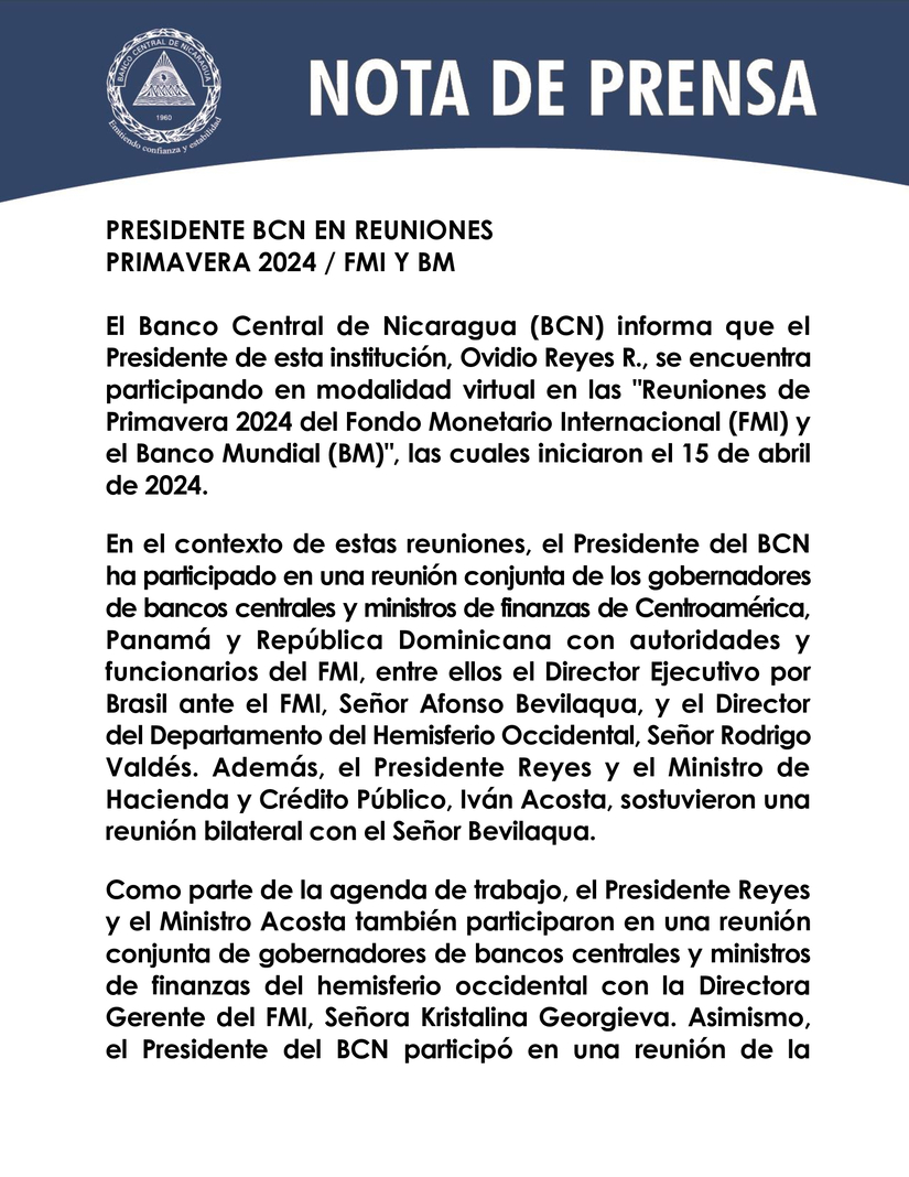 El Banco Central de Nicaragua (BCN) informa que el Presidente de esta institución, Ovidio Reyes R., se encuentra participando en modalidad virtual en las "Reuniones de Primavera 2024 del Fondo Monetario Internacional (FMI) y el Banco Mundial (BM)", las cuales iniciaron el 15 de abril de 2024.
