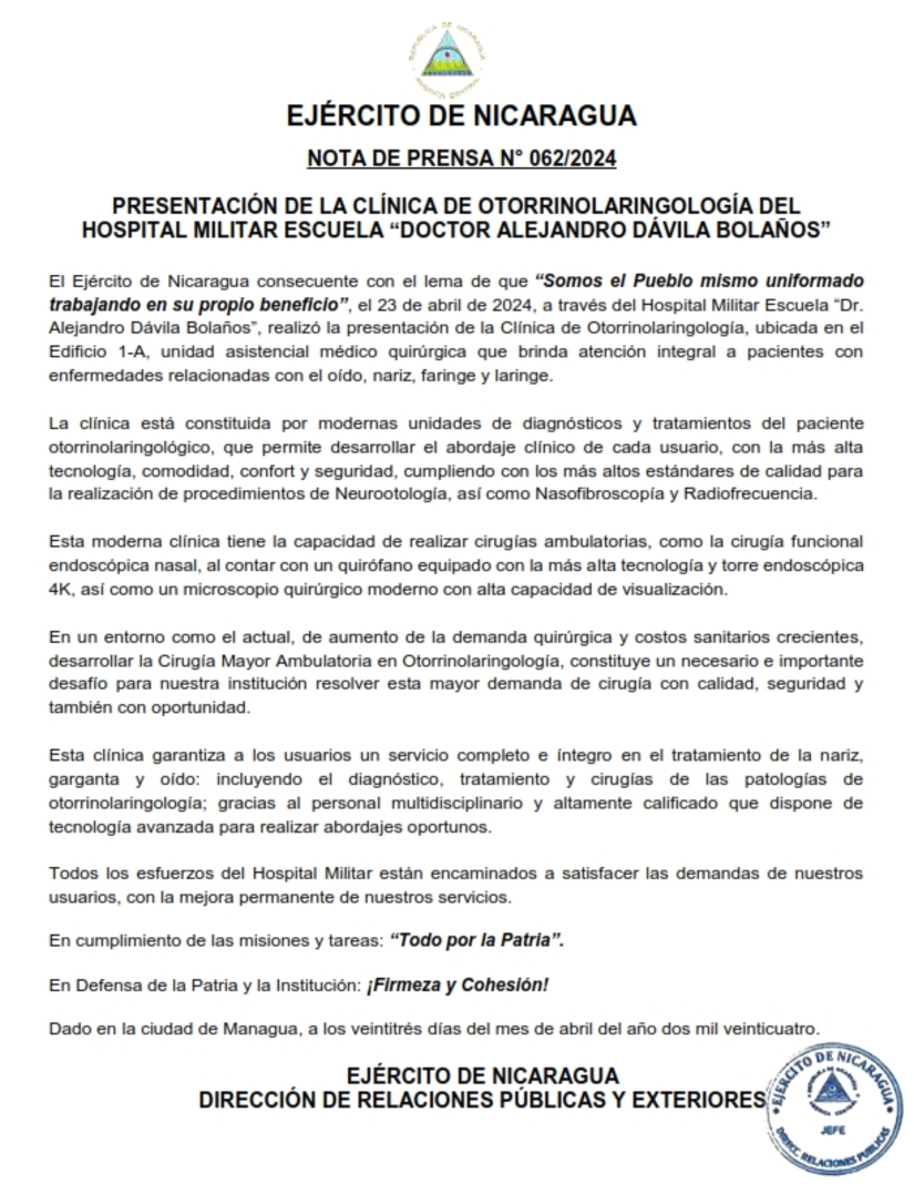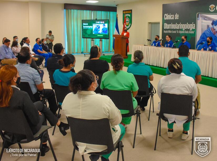 El Ejército de Nicaragua consecuente con el lema de que "Somos el Pueblo mismo uniformado trabajando en su propio beneficio", el 23 de abril de 2024, a través del Hospital Militar Escuela "Dr. Alejandro Dávila Bolaños", realizó la presentación de la Clínica de Otorrinolaringología, ubicada en el Edificio 1-A, unidad asistencial médico quirúrgica que brinda atención integral a pacientes con enfermedades relacionadas con el oído, nariz, faringe y laringe.