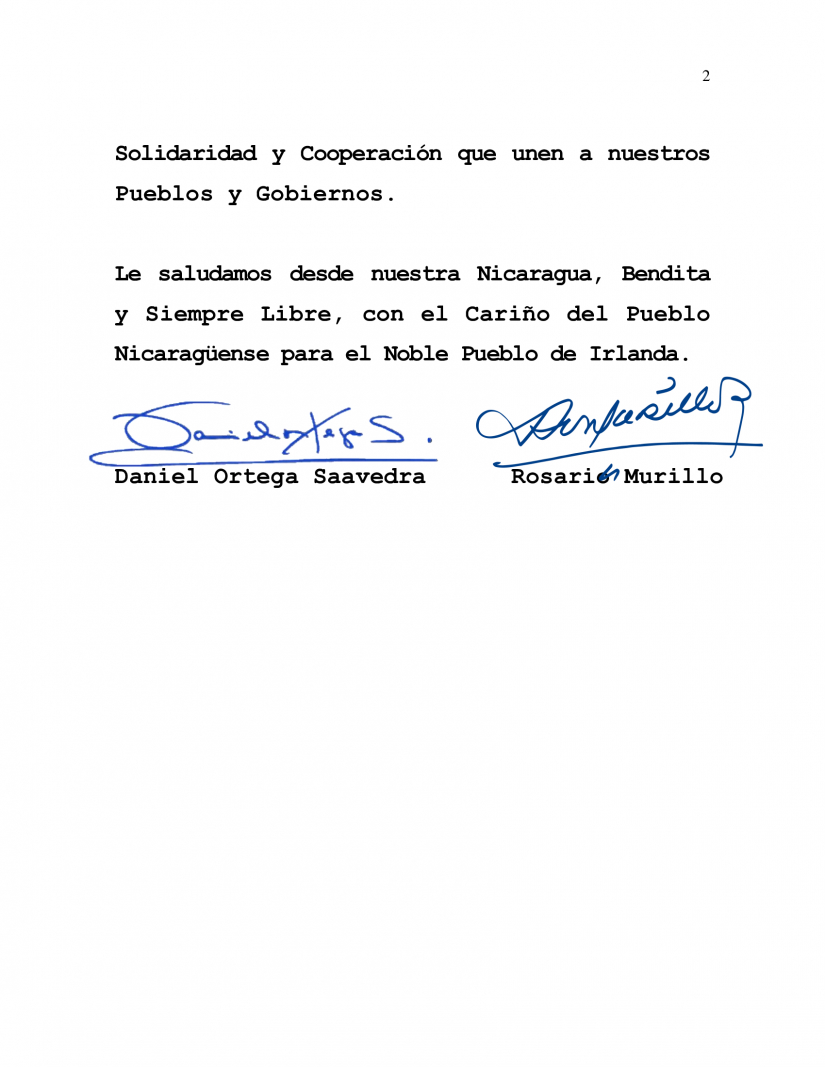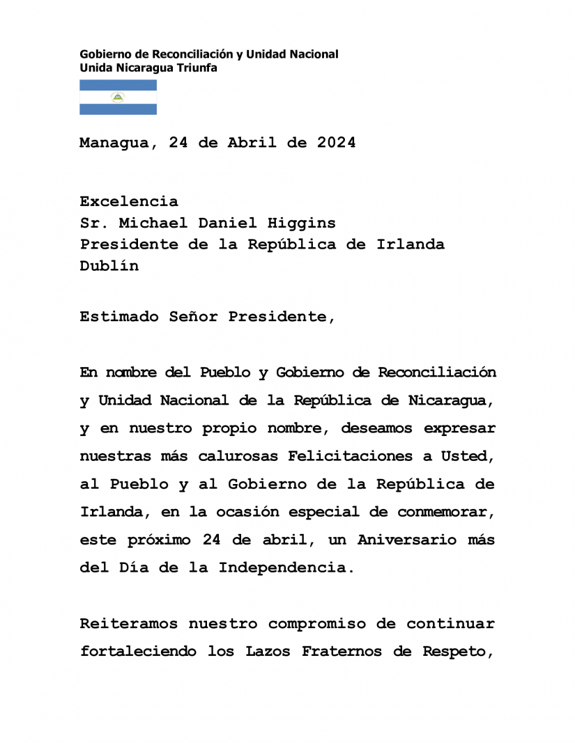 En nombre del Pueblo y Gobierno de Reconciliación y Unidad Nacional de la República de Nicaragua, y en nuestro propio nombre, deseamos expresar nuestras más calurosas Felicitaciones a Usted, al Pueblo y al Gobierno de la República de Irlanda, en la ocasión especial de conmemorar, este próximo 24 de abril, un Aniversario más del Día de la Independencia.