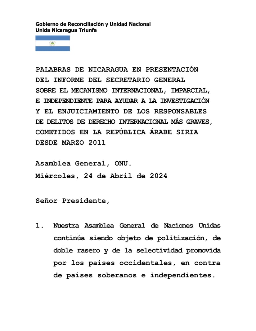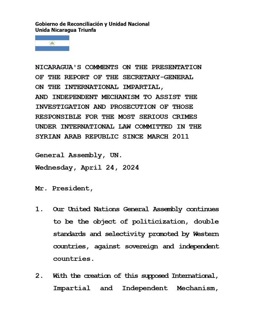 PALABRAS DE NICARAGUA EN PRESENTACIÓN DEL INFORME DEL SECRETARIO GENERAL SOBRE EL MECANISMO INTERNACIONAL, IMPARCIAL, E INDEPENDIENTE PARA AYUDAR A LA INVESTIGACIÓN Y EL ENJUICIAMIENTO DE LOS RESPONSABLES DE DELITOS DE DERECHO INTERNACIONAL MÁS GRAVES, COMETIDOS EN LA REPÚBLICA ÁRABE SIRIA DESDE MARZO 2011