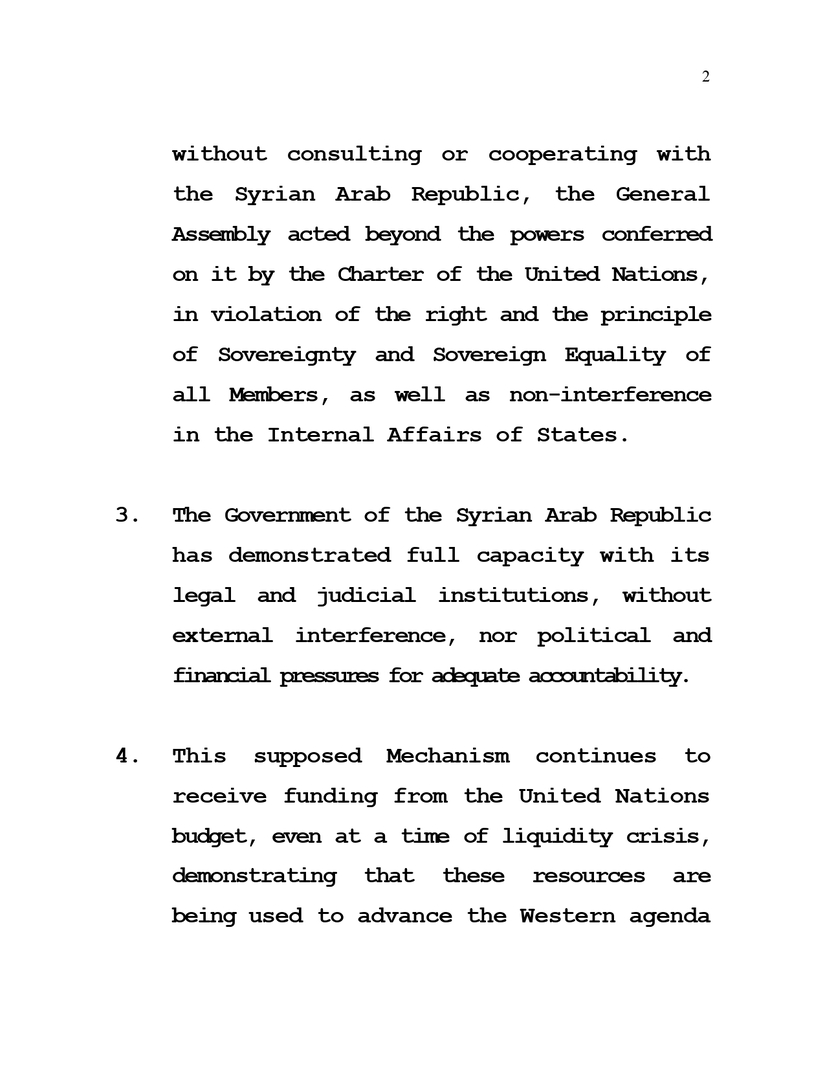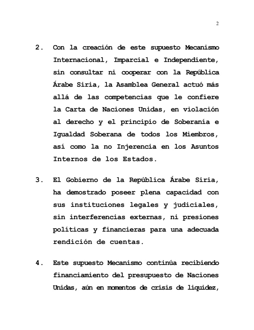 2. Con la creación de este supuesto Mecanismo Internacional, Imparcial e Independiente, sin consultar ni cooperar con la República Árabe Siria, la Asamblea General actuó más allá de las competencias que le confiere la Carta de Naciones Unidas, en violación al derecho y el principio de Soberanía e Igualdad Soberana de todos los Miembros, así como la no Injerencia en los Asuntos Internos de los Estados.