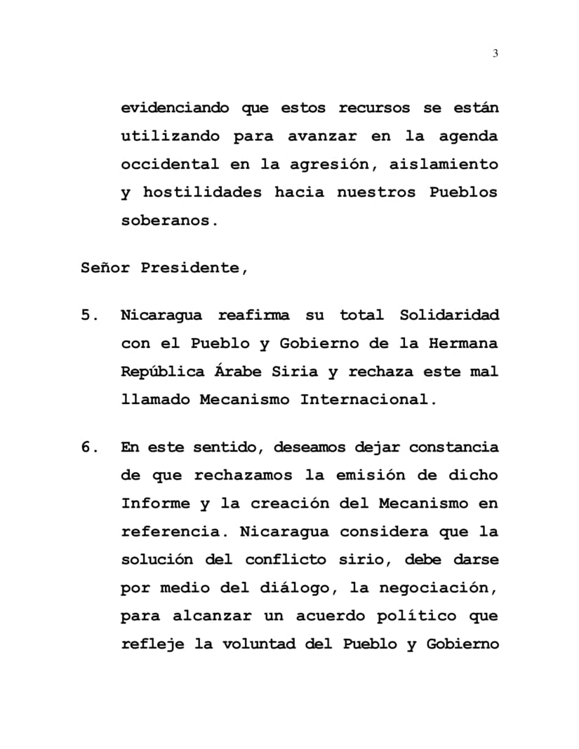 5. Nicaragua reafirma su total Solidaridad con el Pueblo y Gobierno de la Hermana República Árabe Siria y rechaza este mal llamado Mecanismo Internacional.