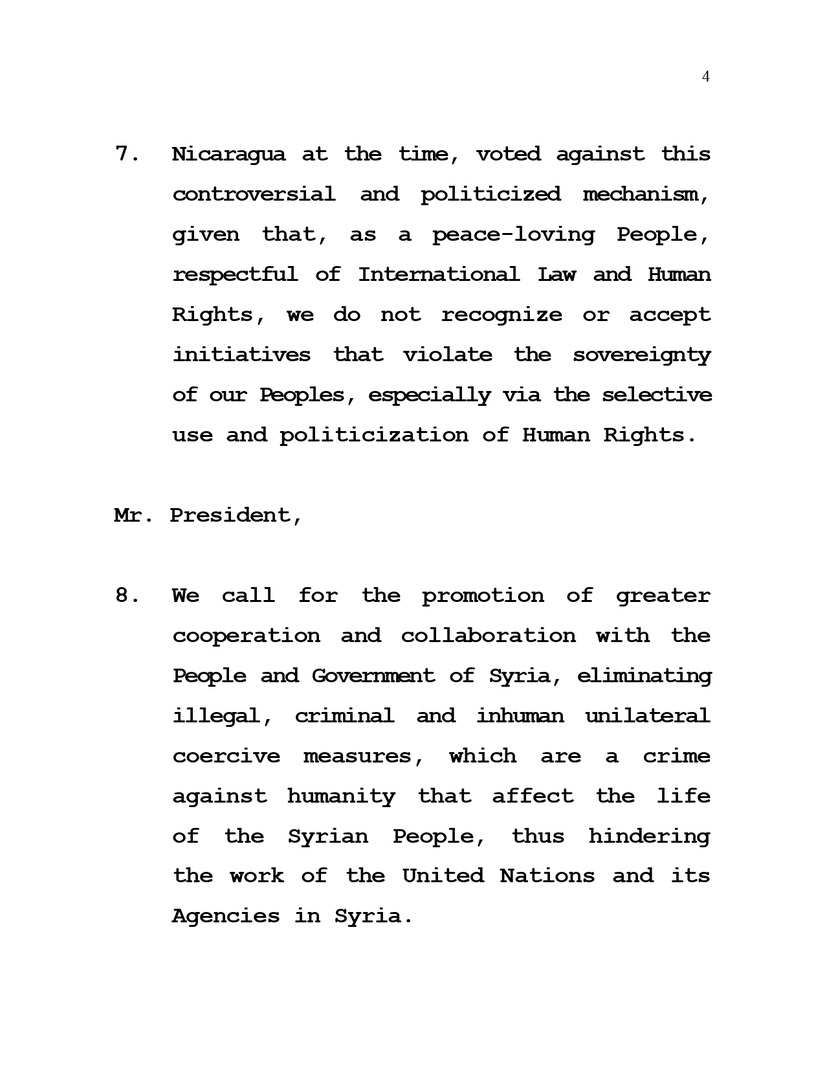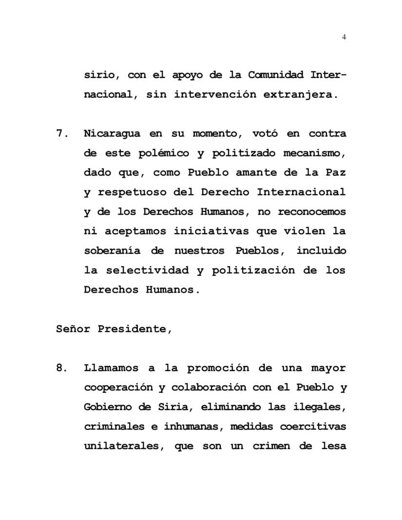 7. Nicaragua en su momento, votó en contra de este polémico y politizado mecanismo, dado que, como Pueblo amante de la Paz y respetuoso del Derecho Internacional y de los Derechos Humanos, no reconocemos ni aceptamos iniciativas que violen la soberanía de nuestros Pueblos, incluido la selectividad y politización de los Derechos Humanos.