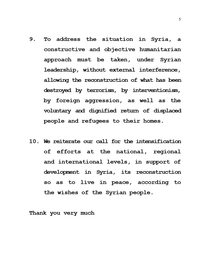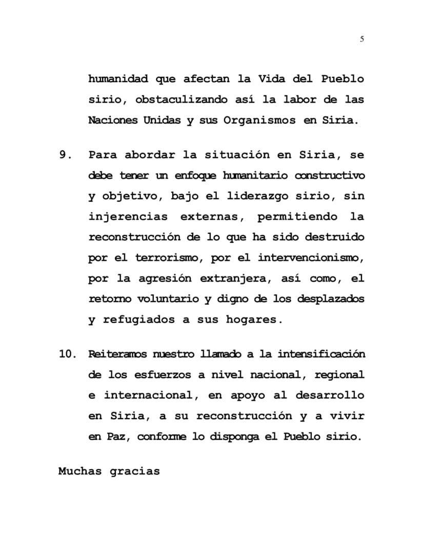 9. Para abordar la situación en Siria, se debe tener un enfoque humanitario constructivo y objetivo, bajo el liderazgo sirio, sin injerencias externas, permitiendo la reconstrucción de lo que ha sido destruido por el terrorismo, por el intervencionismo, por la agresión extranjera, así como, el retorno voluntario y digno de los desplazados y refugiados a sus hogares.