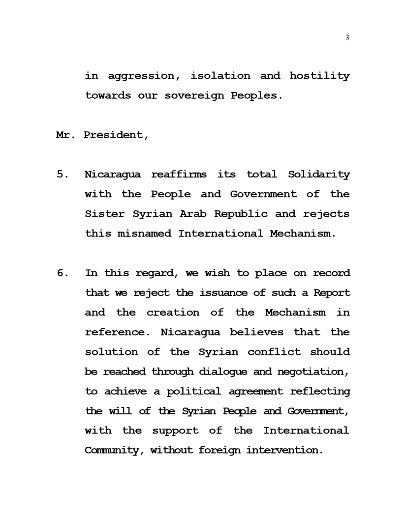 6. En este sentido, deseamos dejar constancia de que rechazamos la emisión de dicho Informe y la creación del Mecanismo en referencia. Nicaragua considera que la solución del conflicto sirio, debe darse por medio del diálogo, la negociación, para alcanzar un acuerdo político que refleje la voluntad del Pueblo y Gobierno sirio, con el apoyo de la Comunidad Internacional, sin intervención extranjera.