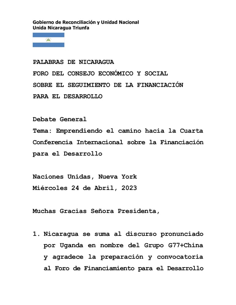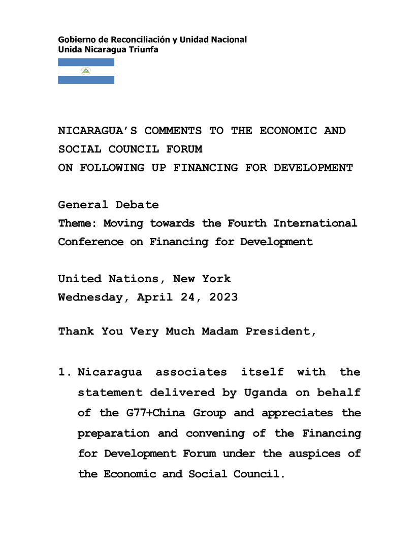 1. Nicaragua se suma al discurso pronunciado por Uganda en nombre del Grupo G77+China y agradece la preparación y convocatoria al Foro de Financiamiento para el Desarrollo bajo los auspicios del Consejo Económico y Social.