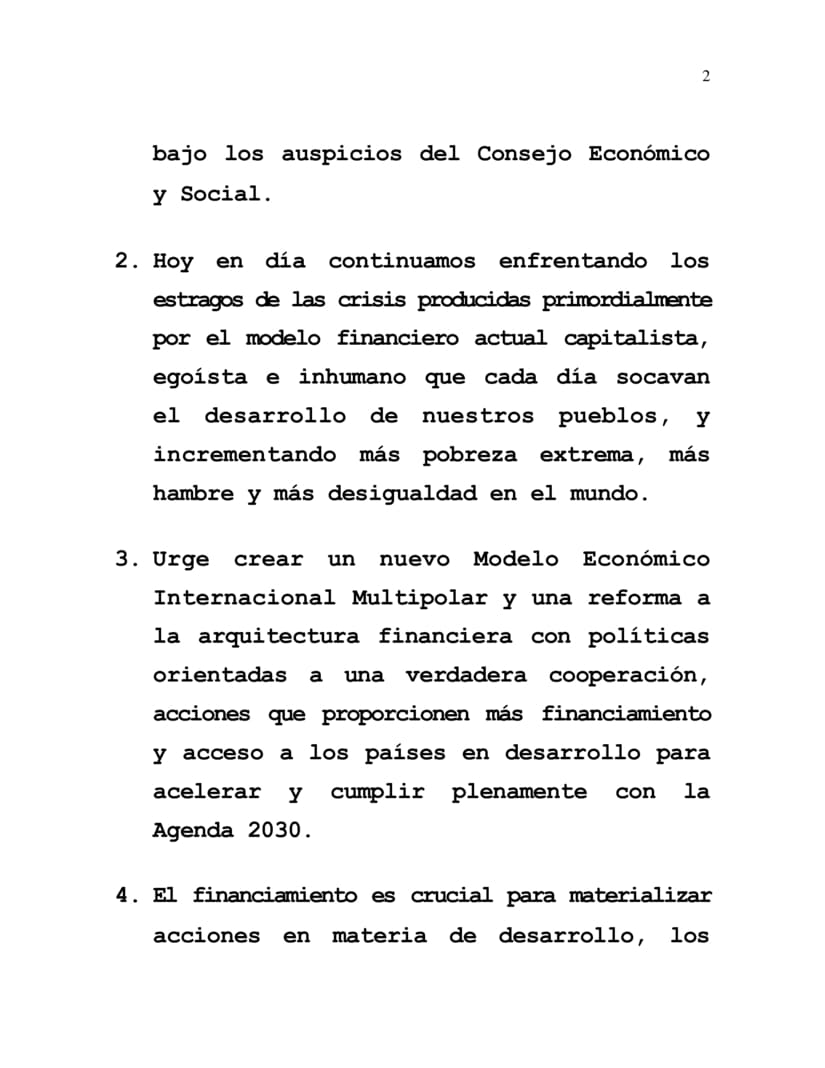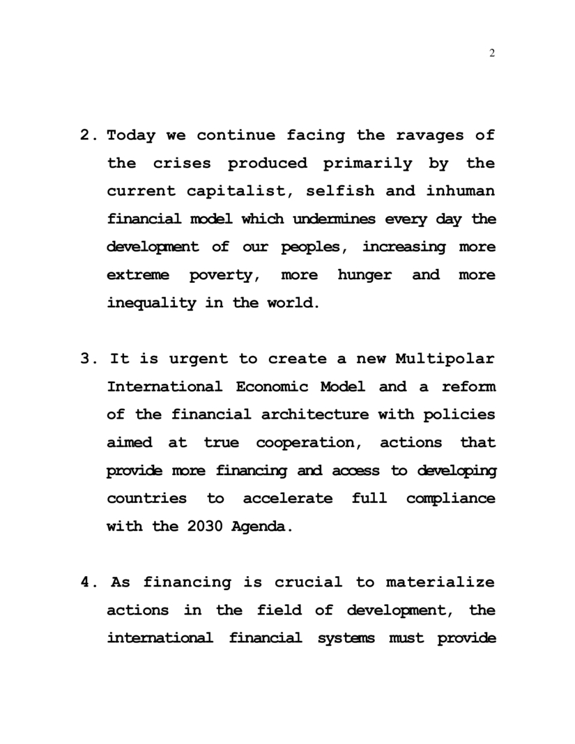 3. It is urgent to create a new Multipolar International Economic Model and a reform of the financial architecture with policies aimed at true cooperation, actions that provide more financing and access to developing countries to accelerate full compliance with the 2030 Agenda.