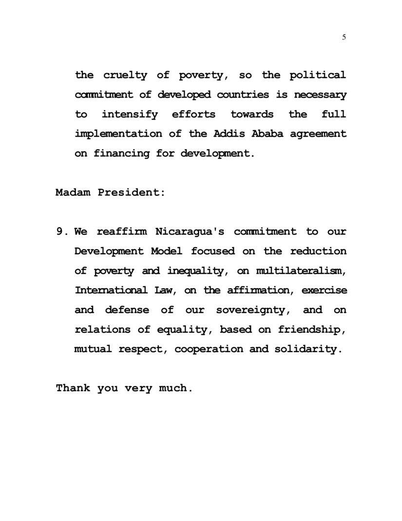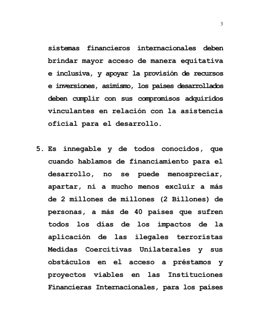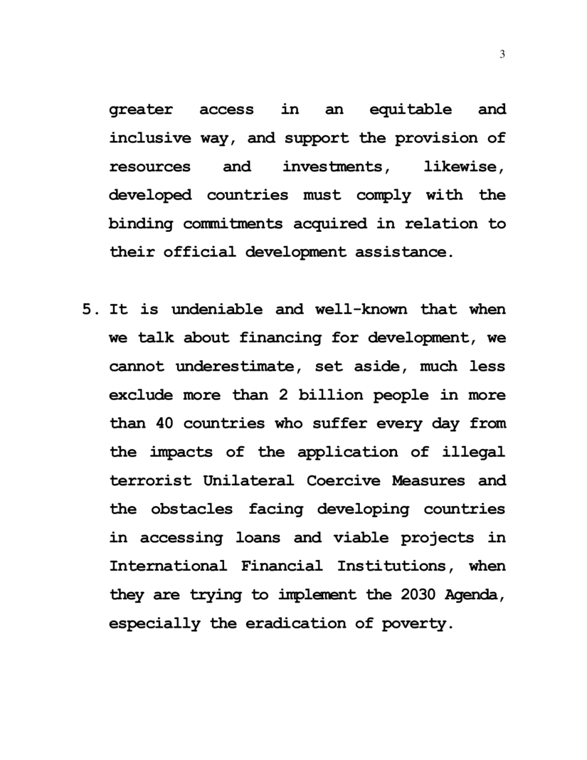 5.It is undeniable and well-known that when we talk about financing for development, we cannot underestimate, set aside, much less exclude more than 2 billion people in more than 40 countries who suffer every day from the impacts of the application of illegal terrorist Unilateral Coercive Measures and the obstacles facing developing countries in accessing loans and viable projects in International Financial Institutions, when they are trying to implement the 2030 Agenda,especially the eradication of poverty.