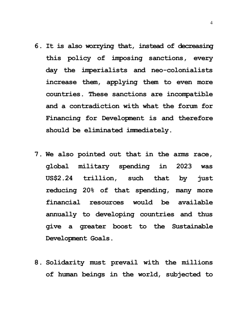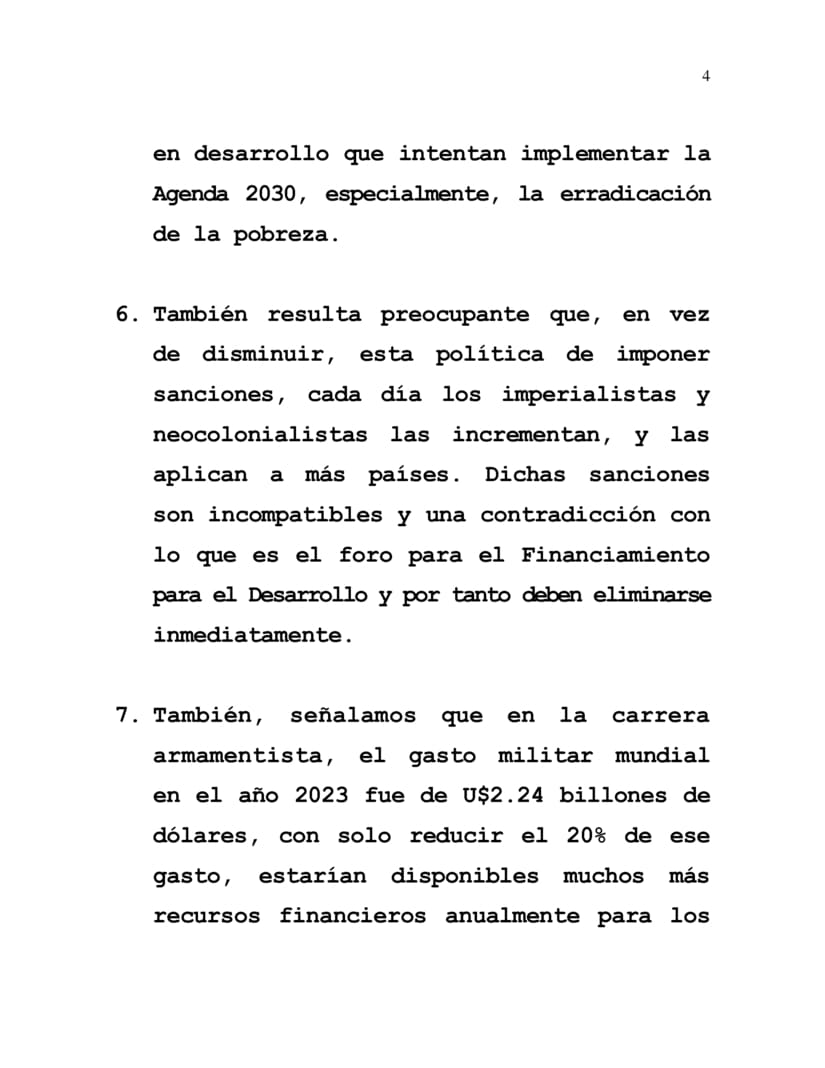 6.It is also worrying that, instead of decreasing this policy of imposing sanctions, every day the imperialists and neo-colonialists increase them, applying them to even more countries. These sanctions are incompatible and a contradiction with what the forum for Financing for Development is and therefore should be eliminated immediately.
