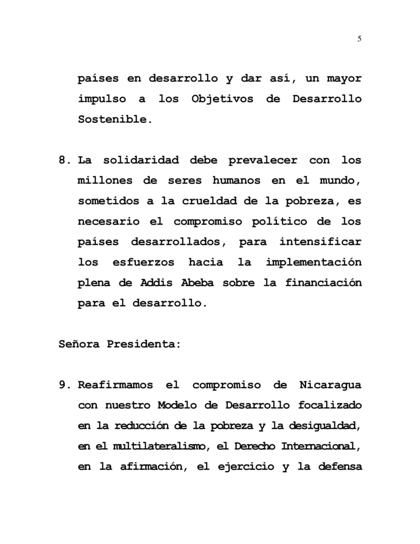 En representación de nuestro Gobierno de Reconciliación y Unidad Nacional de la República de Nicaragua, GRUN, la Compañera Eleane Pichardo Urbina, Embajadora, Representante Permanente Alterna de Nicaragua ante las Naciones Unidas, señaló que el financiamiento es crucial para materializar acciones en materia de desarrollo y que los Países desarrollados deben cumplir con sus compromisos vinculantes adquiridos en relación con la asistencia oficial para el desarrollo.