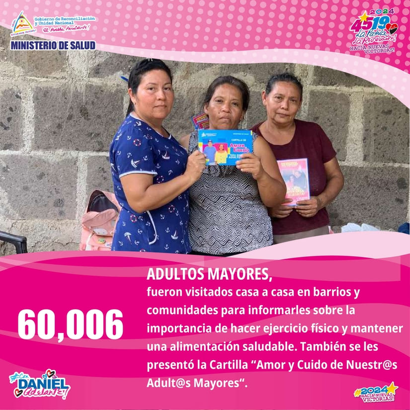 - 60,006 Adult@s Mayores han sido visitados en sus casas en Barrios y Comunidades, para hablar sobre la importancia de hacer ejercicio físico, mantener una alimentación saludable y presentarles la Cartilla “Amor y Cuido de Nuestr@s Adult@s Mayores”.