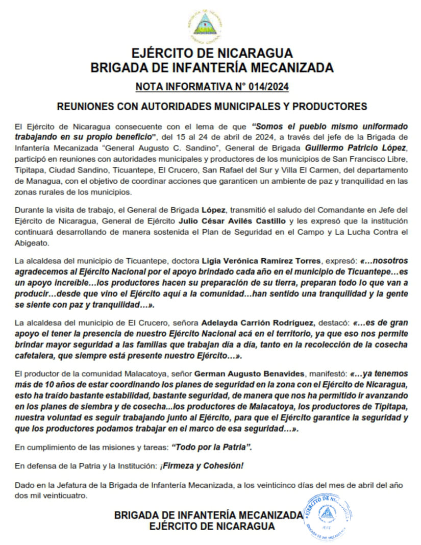 El Ejército de Nicaragua consecuente con el lema de que “Somos el pueblo mismo uniformado trabajando en su propio beneficio”, del 15 al 24 de abril de 2024, a través del jefe de la Brigada de Infantería Mecanizada “General Augusto C. Sandino”, General de Brigada Guillermo Patricio López, participó en reuniones con autoridades municipales y productores de los municipios de San Francisco Libre, Tipitapa, Ciudad Sandino, Ticuantepe, El Crucero, San Rafael del Sur y Villa El Carmen, del departamento de Managua, con el objetivo de coordinar acciones que garanticen un ambiente de paz y tranquilidad en las zonas rurales de los municipios.