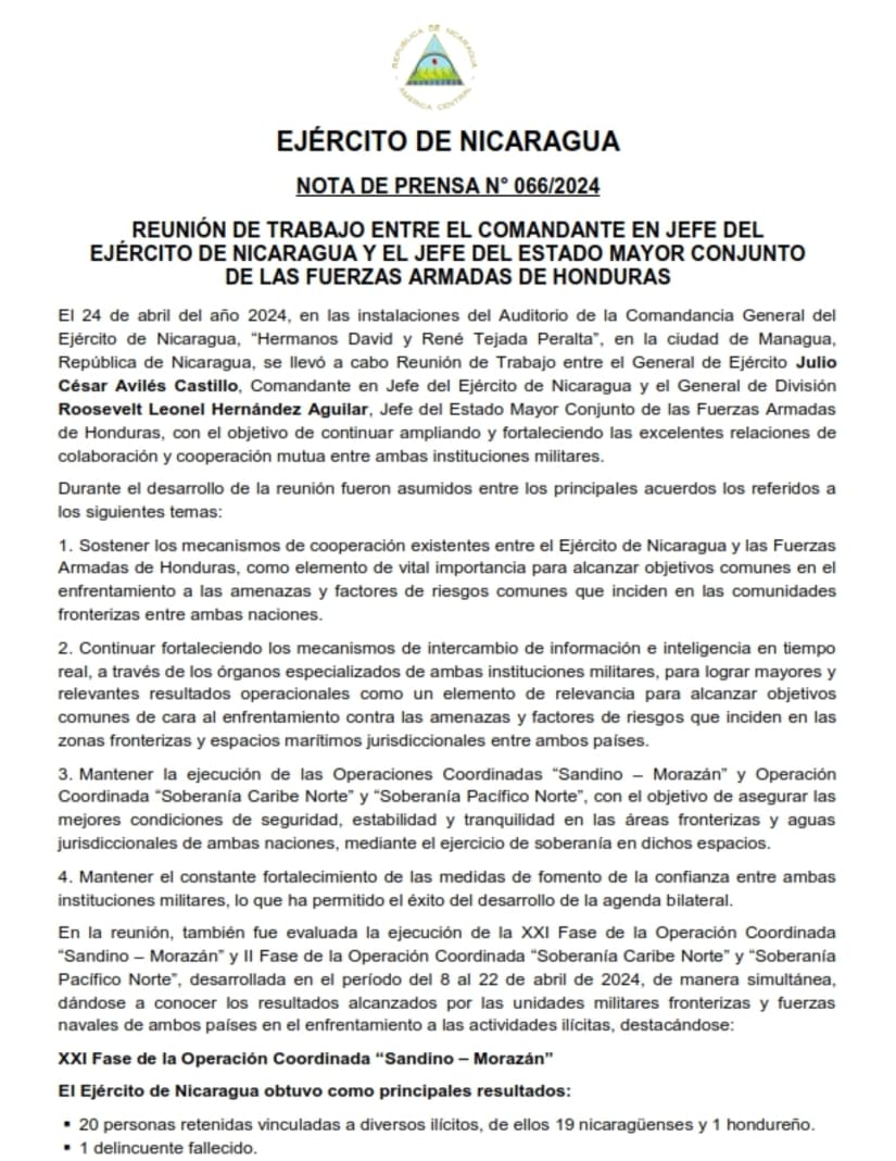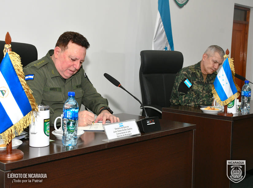 El 24 de abril del año 2024, en las instalaciones del Auditorio de la Comandancia General del Ejército de Nicaragua, “Hermanos David y René Tejada Peralta”, en la ciudad de Managua, República de Nicaragua, se llevó a cabo Reunión de Trabajo entre el General de Ejército Julio César Avilés Castillo, Comandante en Jefe del Ejército de Nicaragua y el General de División Roosevelt Leonel Hernández Aguilar, Jefe del Estado Mayor Conjunto de las Fuerzas Armadas de Honduras, con el objetivo de continuar ampliando y fortaleciendo las excelentes relaciones de colaboración y cooperación mutua entre ambas instituciones militares.