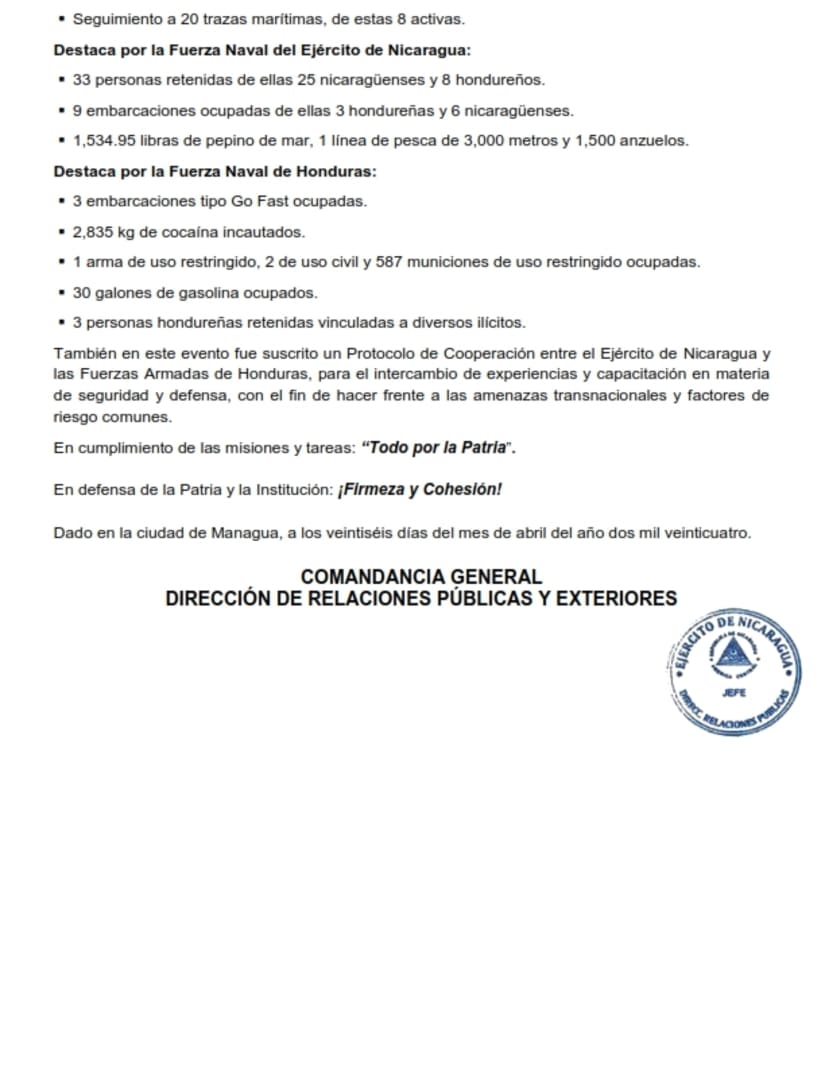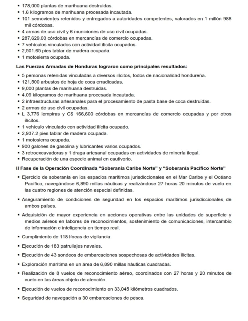 En la reunión, también fue evaluada la ejecución de la XXI Fase de la Operación Coordinada “Sandino – Morazán” y II Fase de la Operación Coordinada “Soberanía Caribe Norte” y “Soberanía Pacífico Norte”, desarrollada en el período del 8 al 22 de abril de 2024, de manera simultánea, dándose a conocer los resultados alcanzados por las unidades militares fronterizas y fuerzas navales de ambos países en el enfrentamiento a las actividades ilícitas, destacándose: