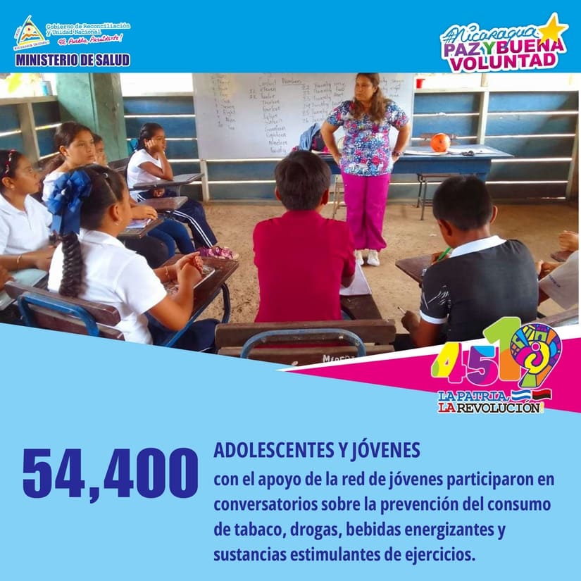• 54,400 adolescentes y jóvenes, con el apoyo de la red de jóvenes, participaron en conversatorios sobre la prevención del consumo de tabaco, drogas, bebidas energizantes y sustancias estimulantes de ejercicios.