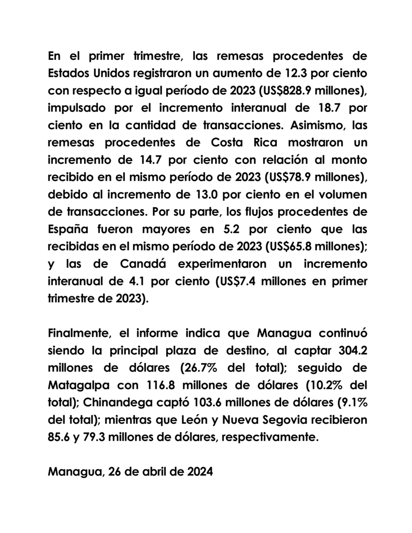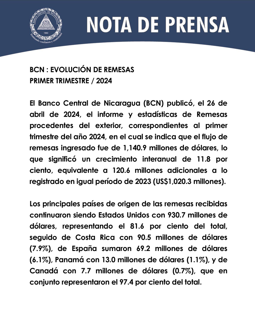 El Banco Central de Nicaragua (BCN) publicó, el 26 de abril de 2024, el informe y estadísticas de Remesas procedentes del exterior, correspondientes al primer trimestre del año 2024, en el cual se indica que el flujo de remesas ingresado fue de 1,140.9 millones de dólares, lo que significó un crecimiento interanual de 11.8 por ciento, equivalente a 120.6 millones adicionales a lo registrado en igual período de 2023 (US$1,020.3 millones).